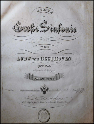 Beethoven, Ludwig van. (1770–1827). Achte Große Sinfonie. 93tes Werk. Partitur.. Vienna: Haslinger. [1837]. Title, 133 pp. Engraved. [PN] 7060. Contemporary red cloth and boards. Scattered light foxing rarely extending to within the plate, first two leaves partially adhered along the gutter and repaired with paper (without losses). A very good copy. The second edition of the great Eighth Symphony and the first to be published in this folio size. Kinsky/Halm p. 265; Hoboken II, 407.