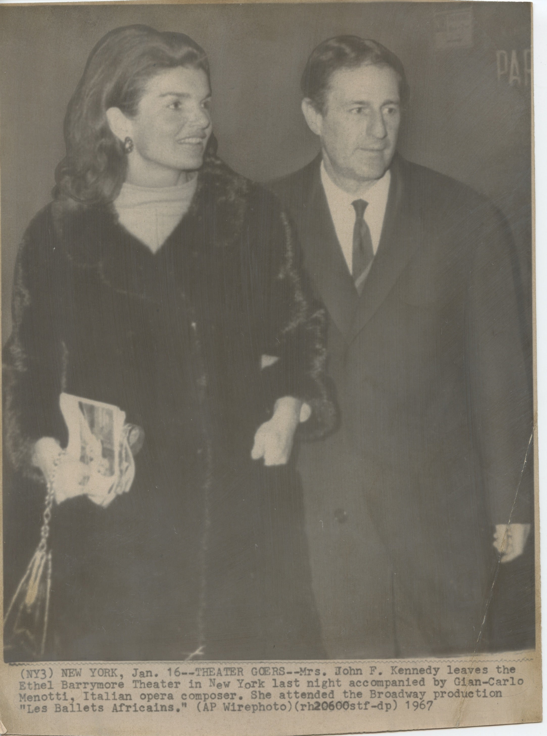 Menotti, Gian Carlo. (1911–2007) [Kennedy Onassis, Jacqueline. (1929–1994)]. Original Photograph. Original 1967 press photograph of Menotti and Kennedy at a performance of "Les Ballets Africains" in New York. 7.25 x 9.75 inches (18 x 24.5 cm). Crease lower right, irregularly trimmed, else fine.
