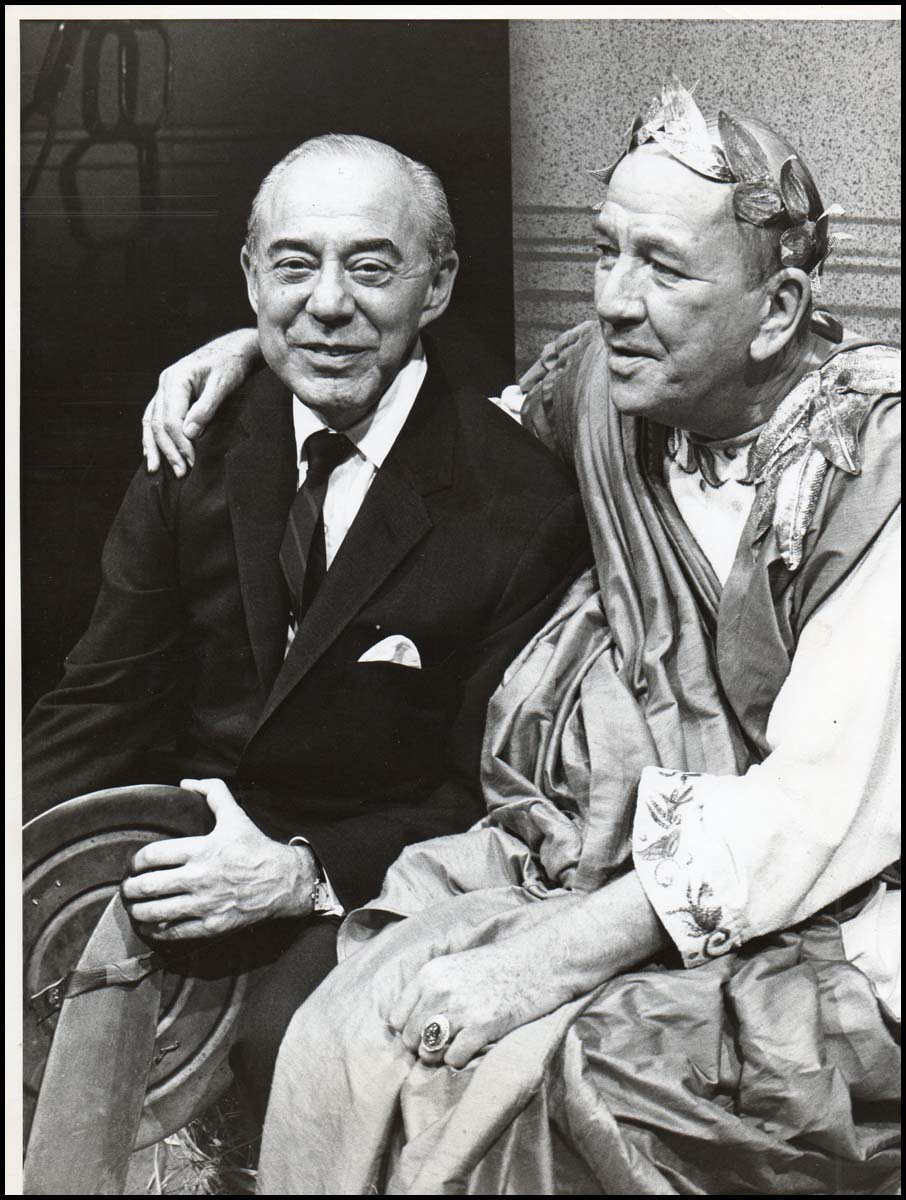 Charming vintage 8 x 10 inch 1967 photograph of Coward and Rodgers sharing a quiet moment on the TV set of Rodgers' musical adaptation of Shaw's "Androcles and the Lion," in which Coward was featured as Caesar. Some creasing to lower corners, else fine.