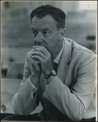 Original vintage 8 x 10 inch press photograph of the composer in a pensive pose. Stamped by the photographer Berko of Aspen, CO on the verso and with a clipping describing Britten's speech in Aspen when he received the first annual Aspen Award.