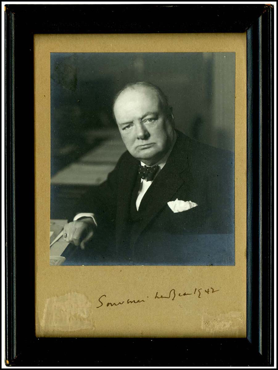 Churchill, Winston. (1874–1965). Inscribed New Year's Photograph. Nice photograph of the Prime Minister looking customarily resolute. 4 x 3.5 inch half-length, unsigned, but inscribed in fountain pen on mount beneath the image, "Souvenir New Year 1942" in the Prime Minister's hand in fountain pen. Minor silvering at photo edges, otherwise fine. Contained under glass within simple wood frame. Overall 5 x 6.5 inches.