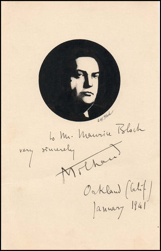 Boldly signed original black ink portrait of the French composer. Signed by the artist Maurice Bloch within the image and inscribed to him below by Milhaud: "To E. Maurice Bloch very sincerely A. Milhaud / Oakland (Calif) January 1941." 14.5 x 22.5 cm. In fine condition.