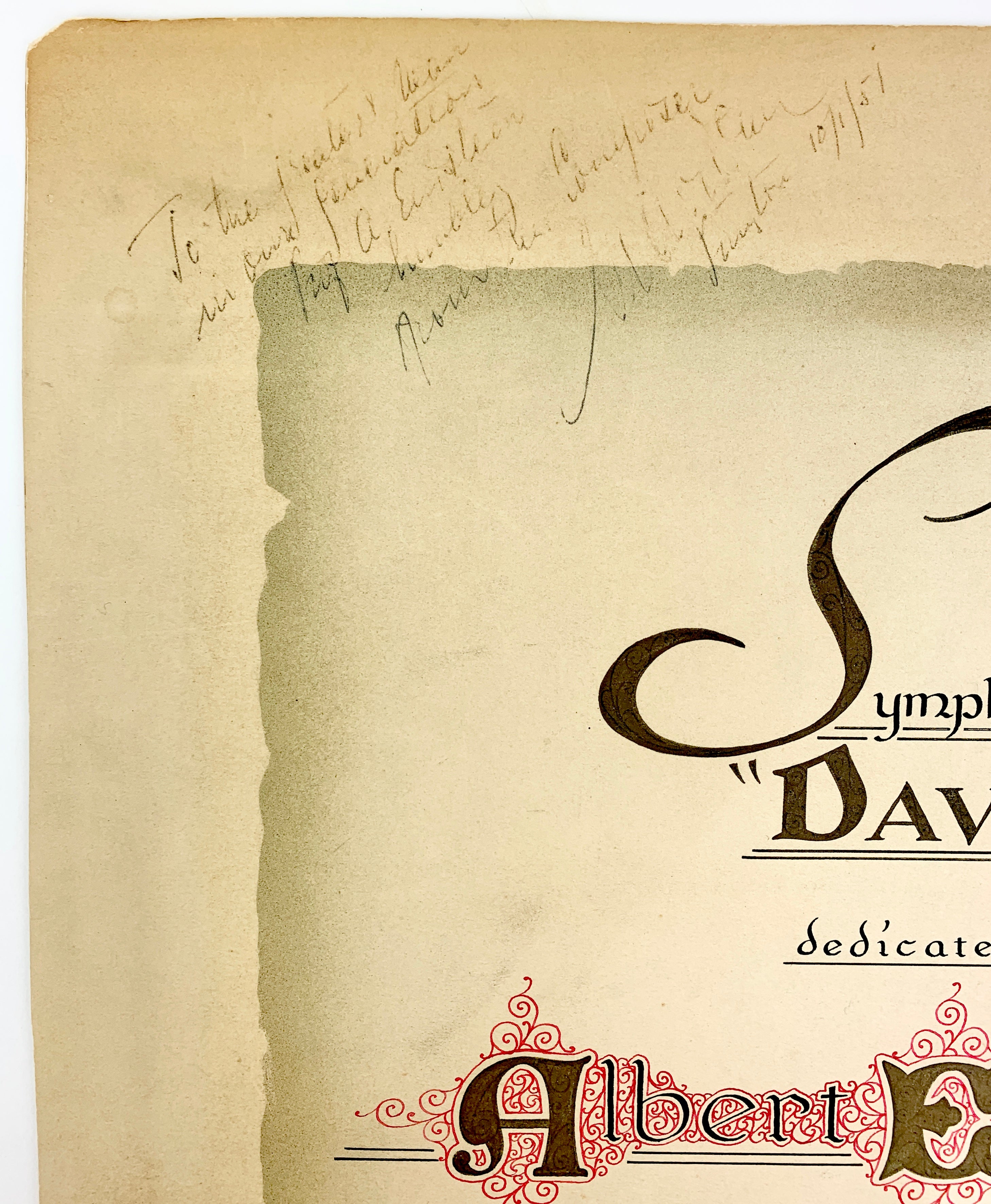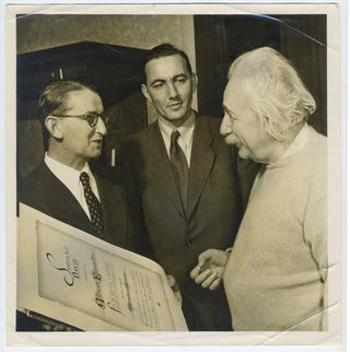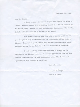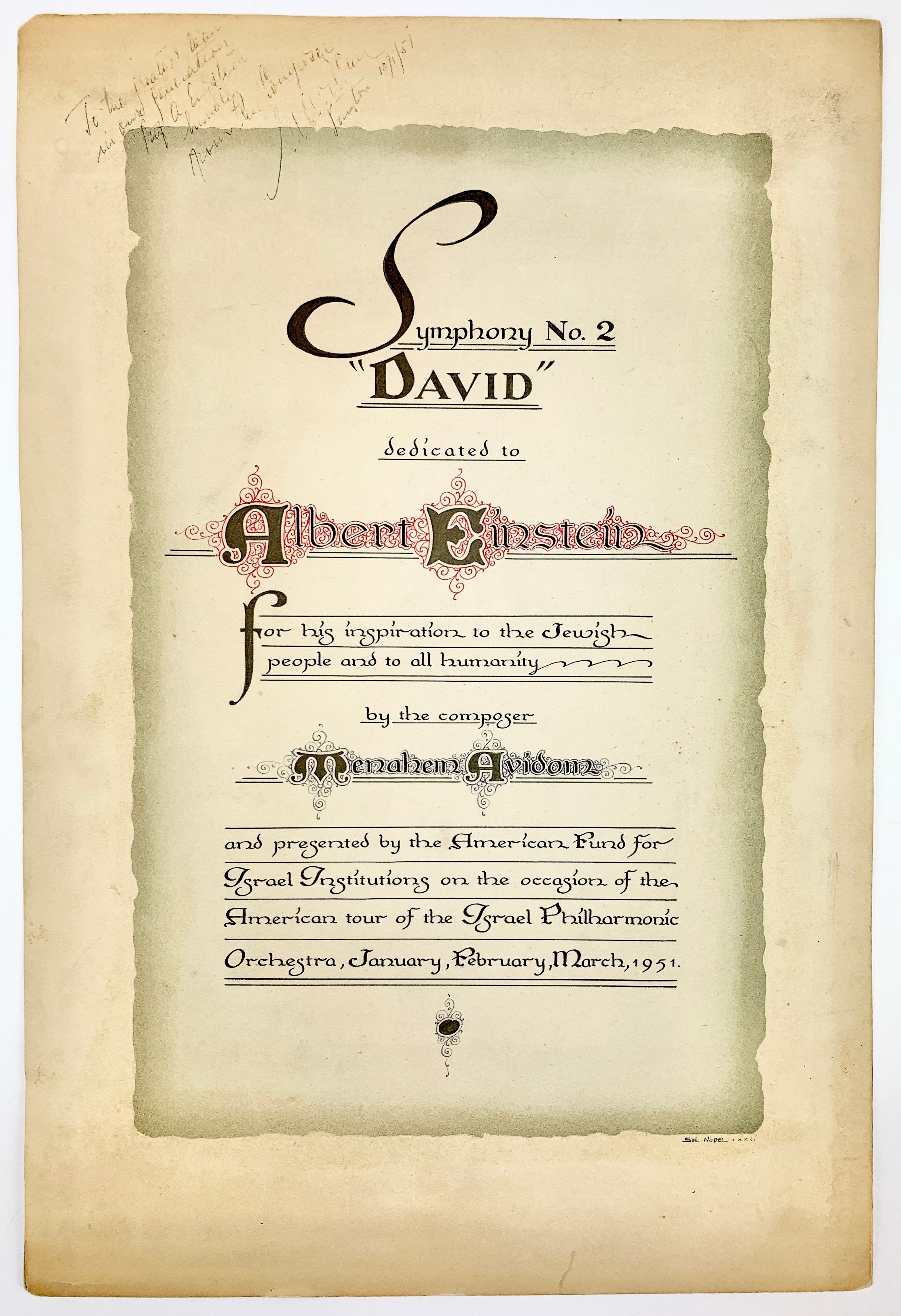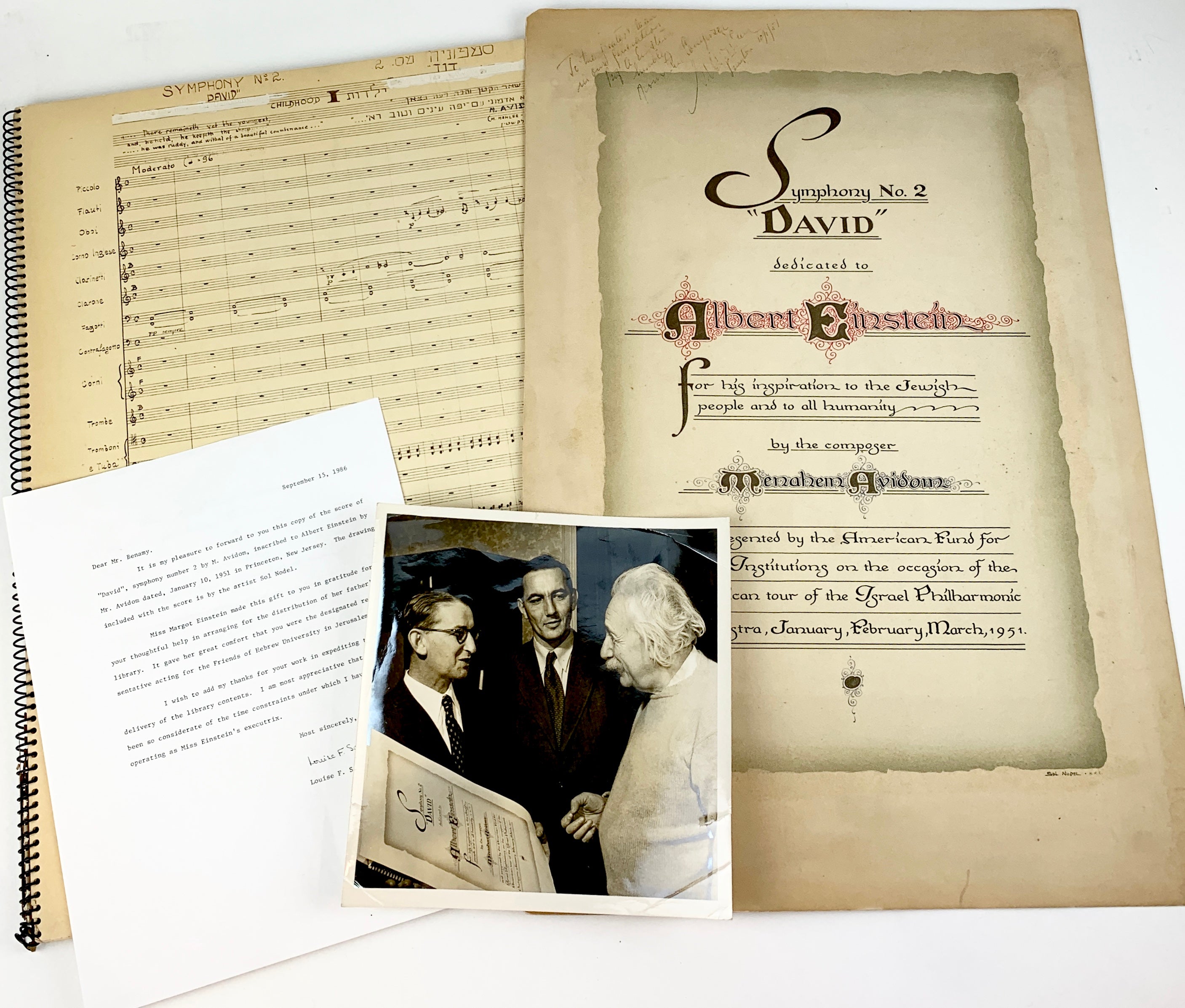[Einstein, Albert. (1879 - 1955) ] Avidom, Menachem. (1908 - 1995). Symphony No. 2 "David" Dedicated to Albert Einstein, with Presentation Broadside to Einstein and Original Photograph. Tel-Aviv, Israel [New York]: Israeli Music Publications [Independent Music Publishers]. [1951]. First edition. Large format published facsimile manuscript orchestral score. 85 pages. Folio (14 x 19 inch; 35 x 49 cm), spiral bound, plain boards; covers detached, generally sound internally. Together with an elaborate painted calligraphic presentation broadside (14 x 21 inch; 36 x 54 cm) of the Symphony to Albert Einstein by Sol Nodel (1951), "Symphony No. 2 'David' dedicated to Albert Einstein For his inspiration to the Jewish people and to all humanity by the composer Menahem Avidom and presented by the American Fund for Israel Institutions on the occasion of the American tour of the Israel Philharmonic Orchestra, January, February, March 1951," additionally inscribed by the composer in black ink upper left, "To the greatest man in our generation / Prof. A. Einstein / humbly / From the Composer / M. Avidom / Princeton 10/1/51." Together with an original 8 x 8 inch original photograph of the presentation to Einstein and a photocopy of a 1986 letter from Louise F. Sayen later presenting the score and broadside to a Mr. Benamy, noting that "Miss Margot Einstein made this gift to you in gratitude for your thoughtful help in arranging for the distribution of her father's library. It gave her great comfort that you were the designated representative for the Friends of Hebrew University in Jerusalem." In fine condition.