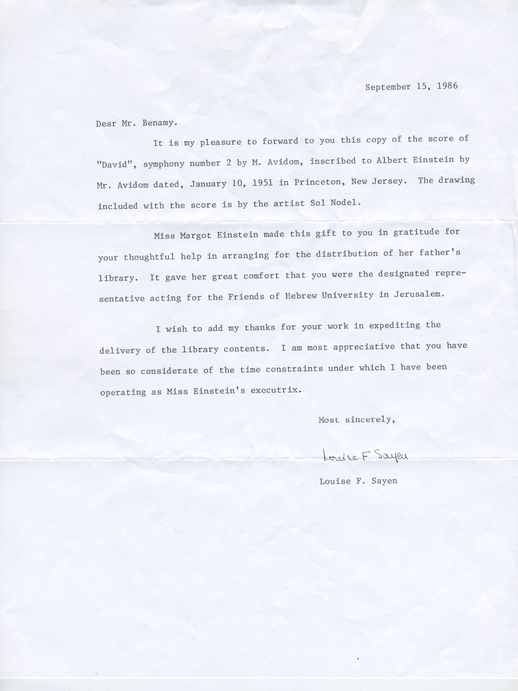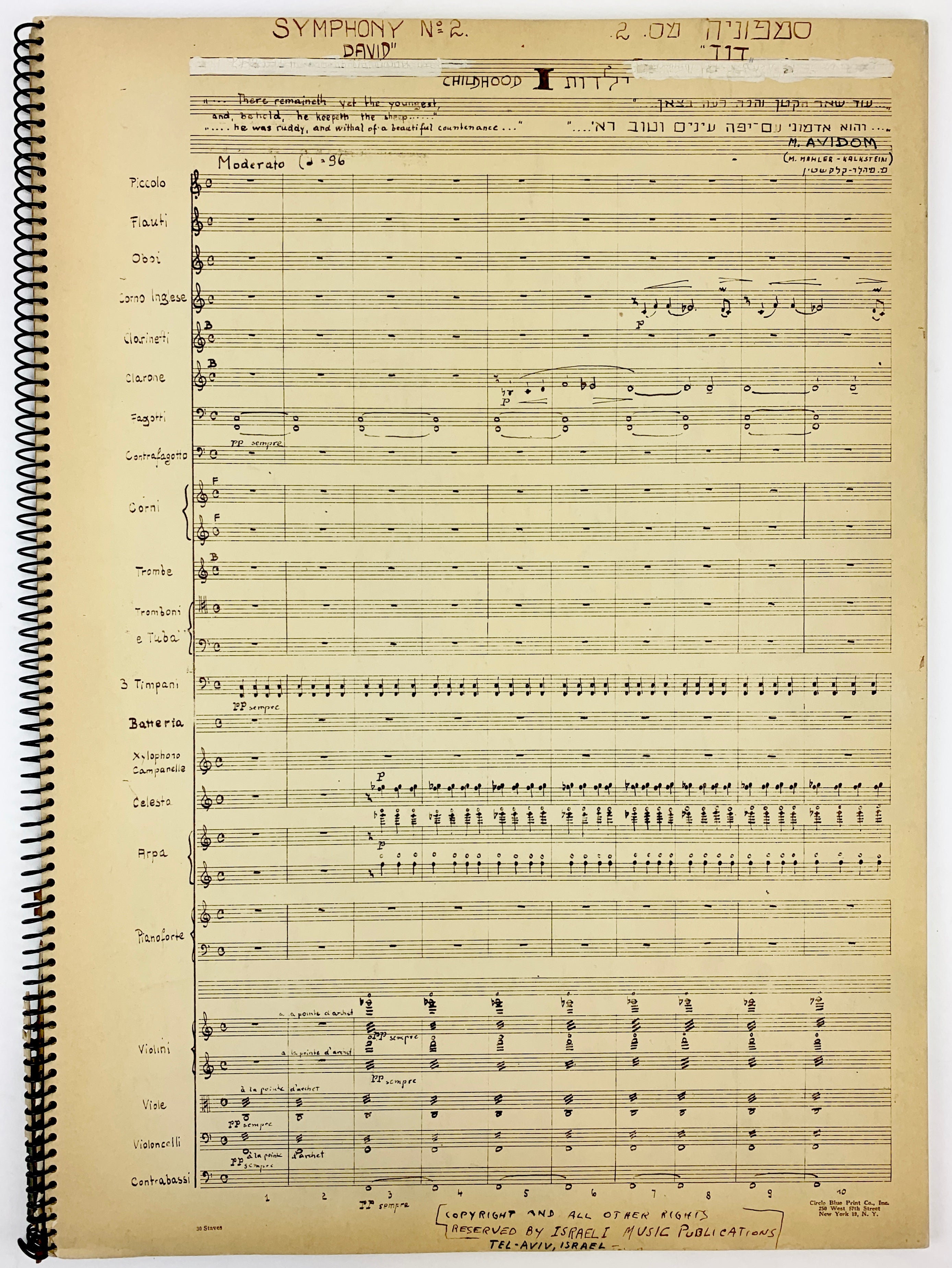 Israeli composer Menachem Avidom was born in Stanislaviv, Austria-Hungary and was apparently a cousin of Gustav Mahler. He studied in Paris, and a later four-year stint in Egypt led him to look beyond European modes on musical theory and composition. In 1939 he wrote musical arrangements for Yemenite-Jewish singer Bracha Zefira and these arrangements sparked his interest in the fusion of Middle Eastern and European music theories, in 1944 writing a series of pieces in the new style that defined the rest of his career as a composer. His compositions helped lay the groundwork for future Mizrahi and Sephardic (Middle Eastern Jewish) musicians in Israel. From 1945, he served as general secretary of the Israeli Philharmonic; in 1955 he was named director of ACUM, the Israeli Performing Rights Society. The presentation of his score to Einstein occurred during the first ever American tour of the Israel Philharmonic, during which the orchestra was conducted by Leonard Bernstein and Serge Koussevitzky and gave 53 concerts in 40 cities.
