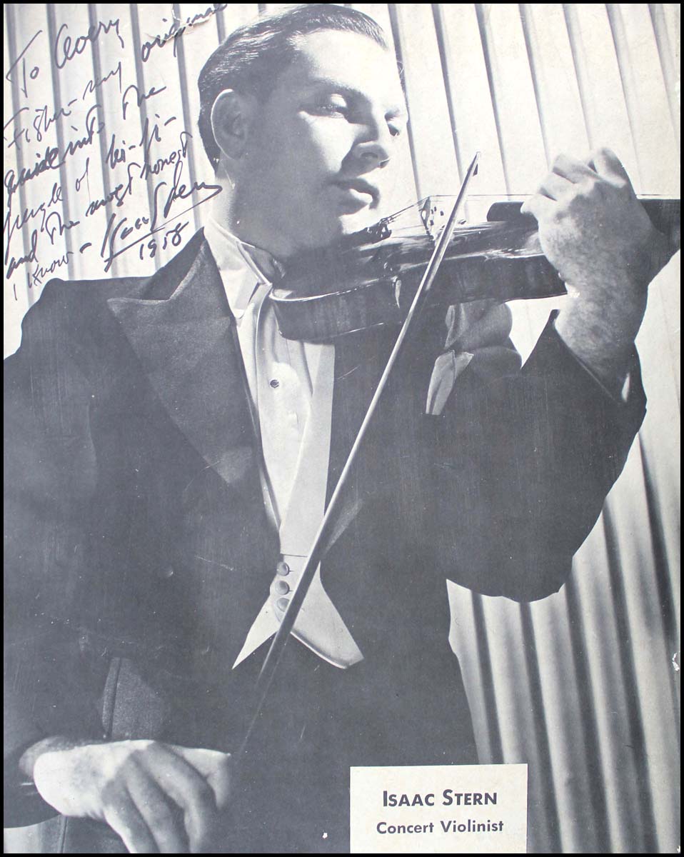 18 x 14 inch rigid poster of the young violinist, with a printed inscription "To Avery Fisher - my original guide into the jungle of hi-fi - and the most honest I know - Isaac Stern / 1958." Edges nicked, tear/crack at upper left extending just into the inscription, else fine.