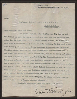 Furtwängler, Wilhelm. (1886-1954). Signed Letter regarding Stuckenschmidt . Typed letter signed "Wilhelm Furtwangler." 1 page. Berlin, 29/6/32. In very good condition, slighly trimmed to 7.5 x 9.5 inches, mounting remnants on verso. Translated in full: "I thank you for your letter dated the 16th of this month and your interest in me which is shown therein. - Were you more familiar with Berlin"s music critics, you would not be so very much surprised regarding Stuckenschmidt [Hans Heinz Stuckenschmidt (1901 - 1988), German composer, musicologist, and historian and critic of music]. Recently, a great and internationally renowned artist remarked to me, no doubt correctly, that large German cities, particularly Berlin and Vienna, represent the most unpleasant atmosphere with regard to the artistic world that has ever existed. The unscrupulous way by which facts are tampered with and the public is misled to serve biased and tedious party doctrines and intentions, can hardly be surpassed. The only positive thing, however, is that gradually the public is no longer listening to what the Mr. Stuckenschmidt etc. proclaim which, with regard to us artists, is most sensible. Where would we be if we had to be concerned with those things?"