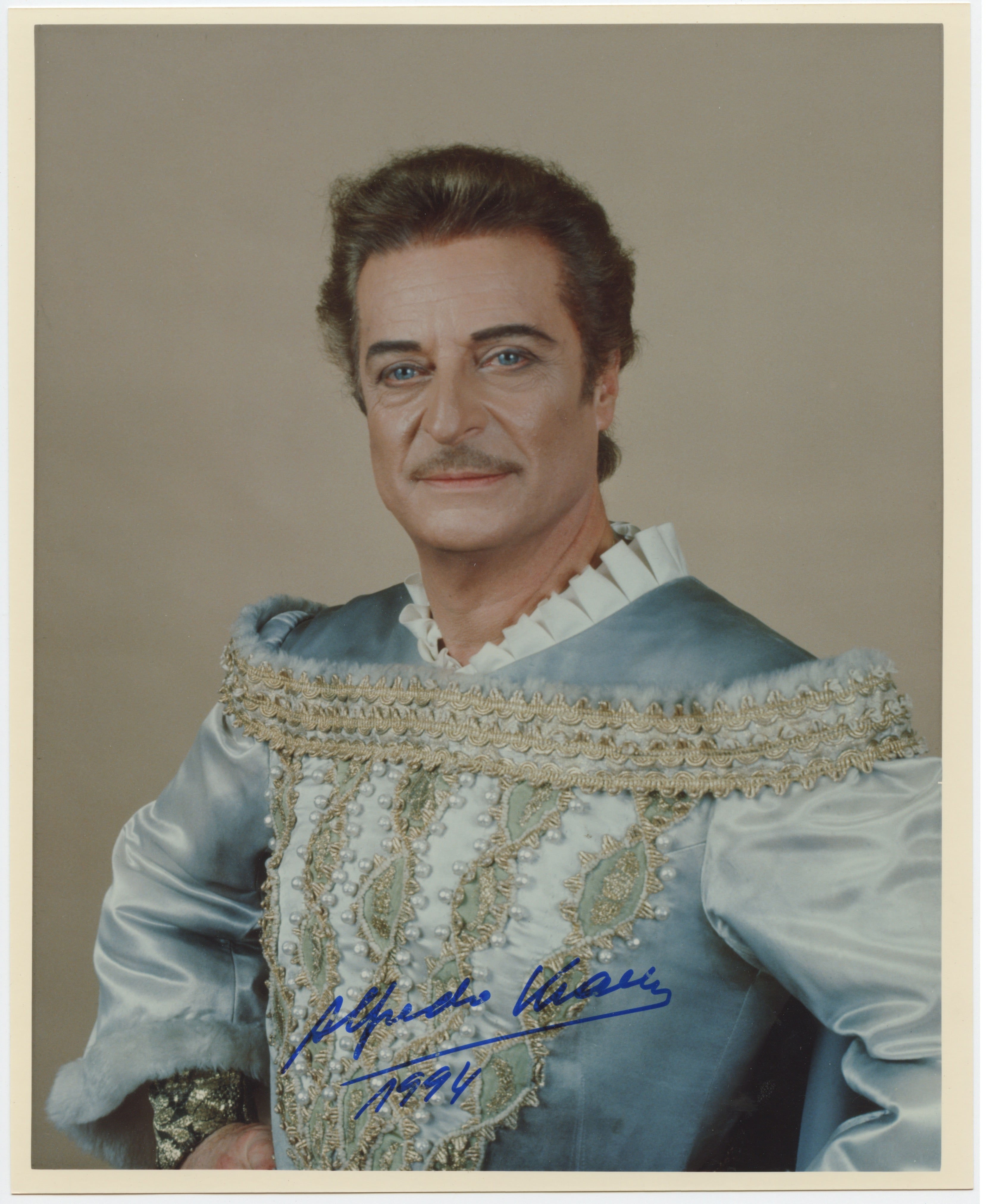 Signed color photograph of the distinguished Spanish tenor as Romeo in Gounod's "Romeo et Juliette," at the Metropolitan Opera. Boldly signed and dated 1994 in blue ink. 8 x 10 inches. Fine.