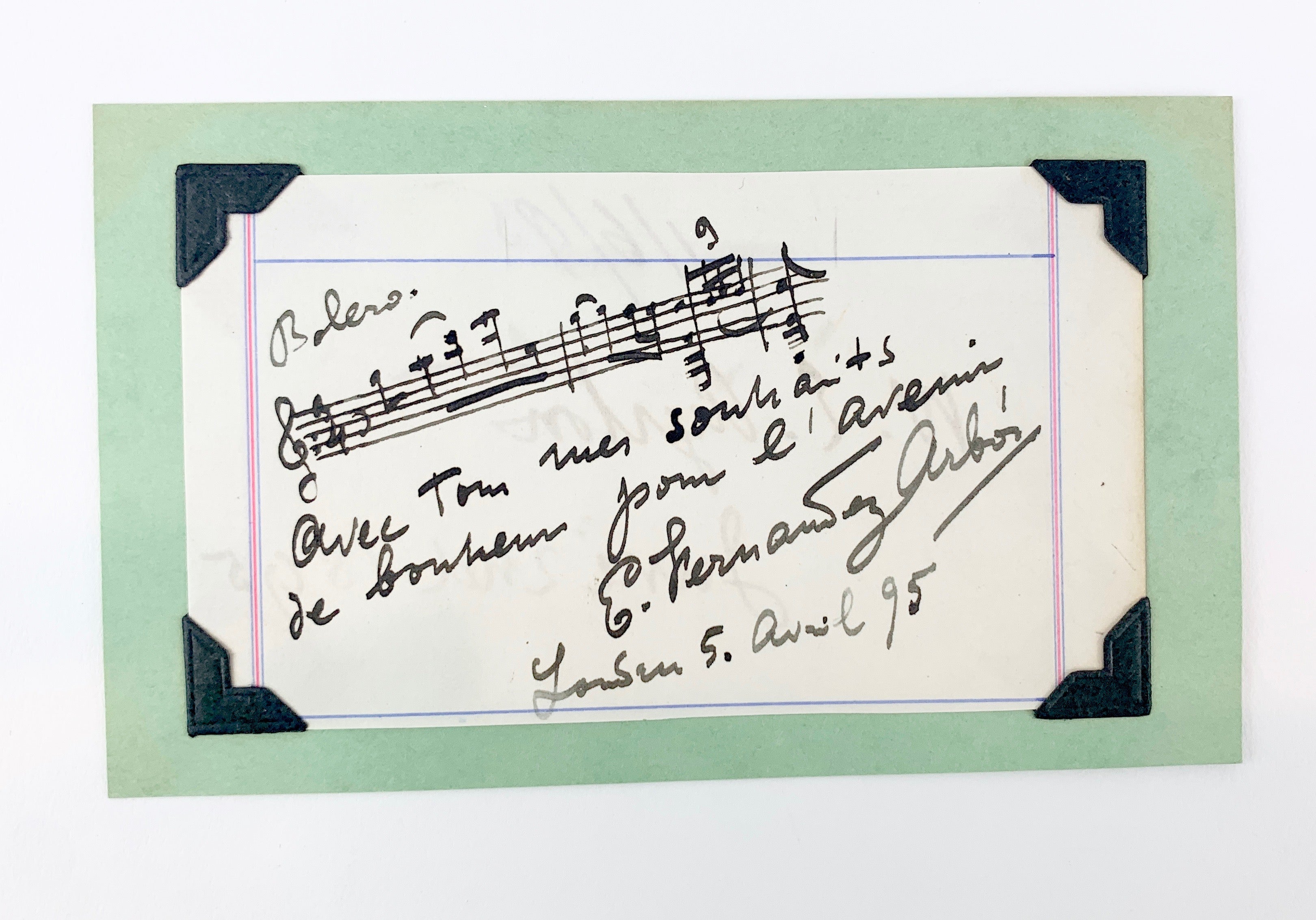 AMQS from the Spanish violinist, composer and conductor, a virtuoso violinist who studied with Monasterio, Vieuxtemps and Joachim, taught at the Madrid Conservatory and the Royal College of Music in London, and who was later one of Spain’s greatest conductors. Three detailed measures from the "Bolero" of his Op. 1 Piano Trio, signed and inscribed and dated London, 5 April, [18]95. On a page measuring 11 x 6 cm, with the signature of English physicist William Edward Ayrton on the verso. In fine condition and quite scarce.