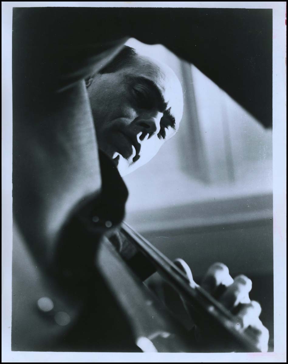 Visually striking original 8 x 10 photograph of the cellist as seen from the unusual perspective of under his bow arm as he performs. In fine condition.