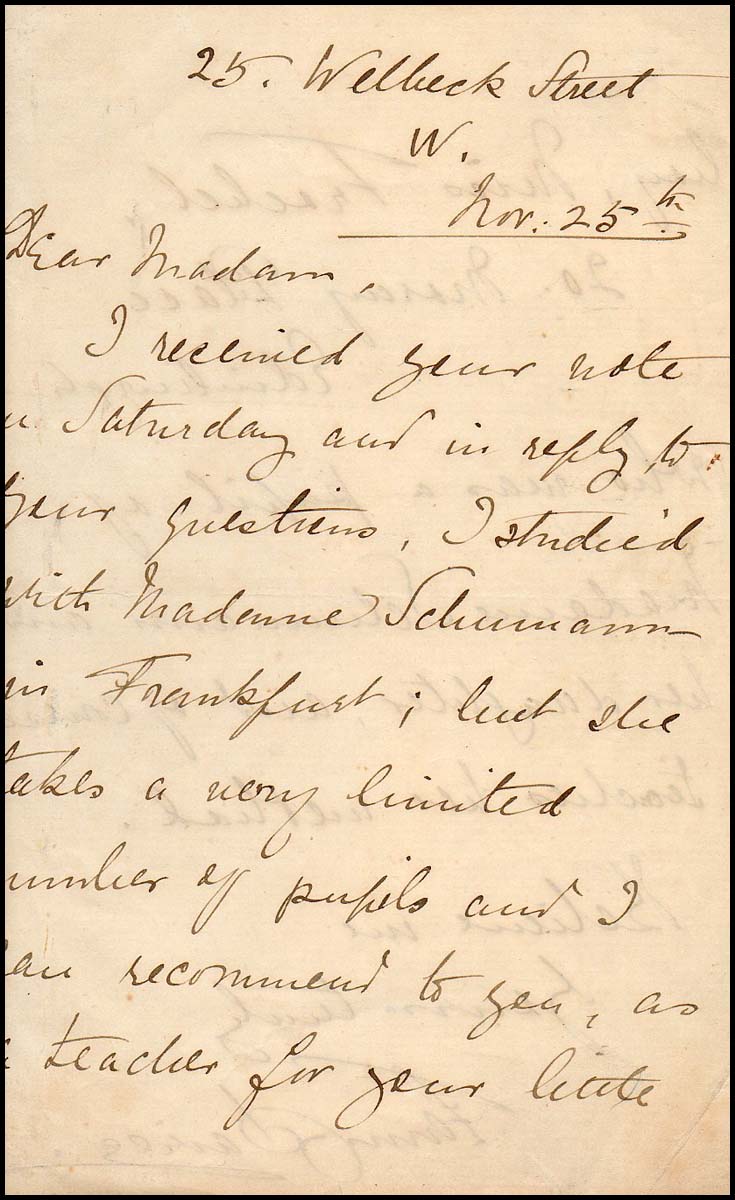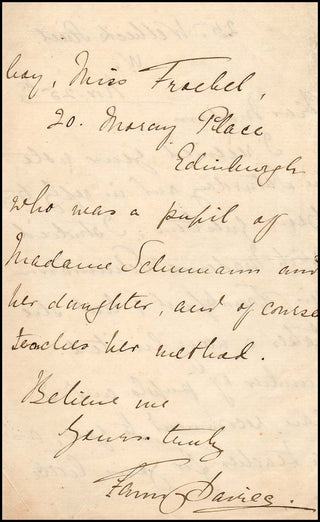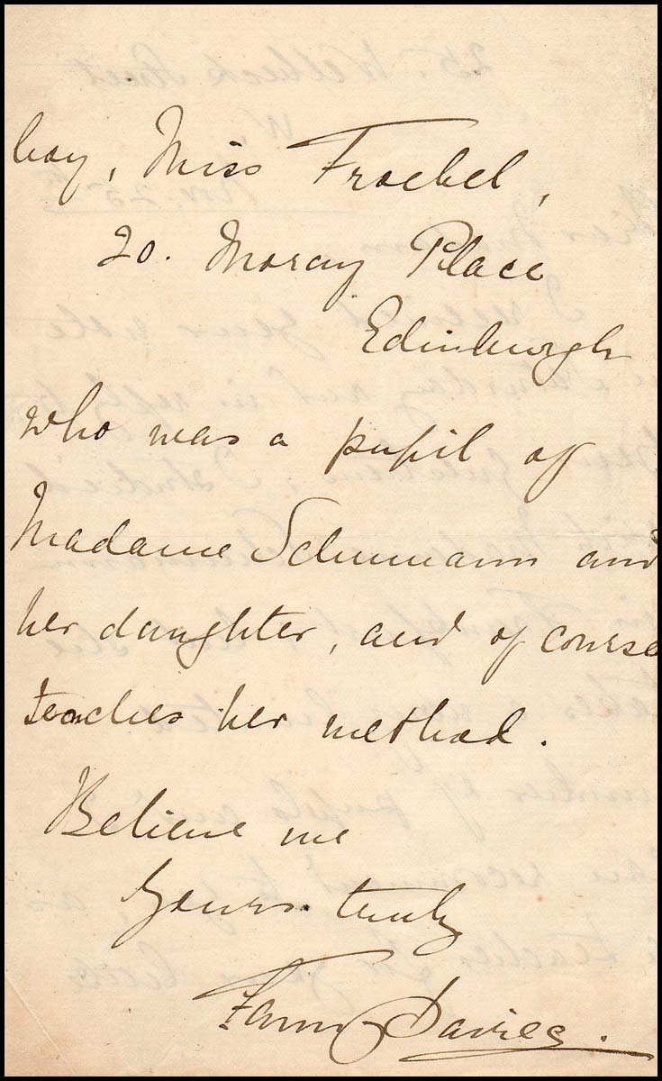 [Schumann, Clara. (1819–1896)] Davies, Fanny. (1861–1934). Autograph Letter regarding lessons with Clara Schumann. Autograph letter, signed "Fanny Davies." 2 pp. November 25th [n.y]. "...I Studied with Madame Schumann in Frankfurt; but she takes a very limited number of pupils and I can recommend to you, as a teacher for your little boy, Miss Frackel...who was a pupil of Madame Schumann and her daughter, and of course teaches her method."