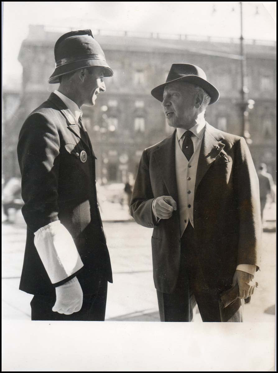 Original 8 x 6 inch press photograph of the great pianist speaking with an Italian police officer in Milan. Dated 1958, fine.