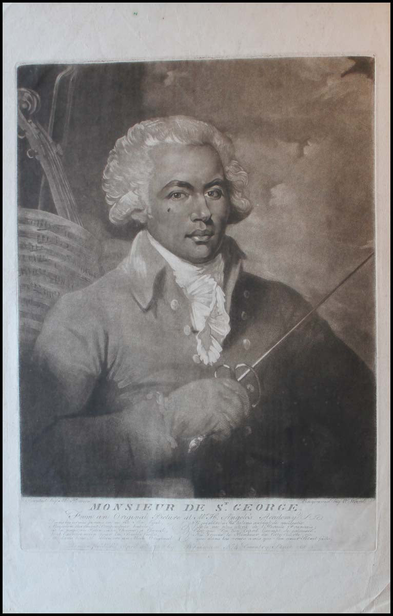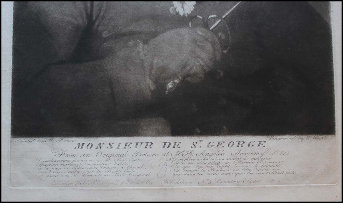 Inscription in plate below image: "Monsieur de St. George/ From an Original Picture at Mr. H. Angelo's Academy"; and verses in French: "Dans les armes jamais on ne vit son egal./ Musicien charmant, compositeur habile,/ à la nage, au patin, à la chasse, à cheval,/ tout exercise enfin pour lui semble facile,/ et dans tous, il découvre un mode original./ Si joindre a ses talens autant de modestie/ Est le nec plus ultra de l'Hercule Français;/ C'est que son bon esprit exempt de jalousie,/ N'a trouvé le bonheur en cette courte vie/ que dans les vrais amis que son coeur s'etoit faits." [He had no equal in arms. A charming musician and clever composer, adept at swimming, skating, hunting and riding to whom all exercise seems easy and where he demonstrates originality. Since he adds modesty to his many talents, we can dub him the ultimate French Hercules whose spirit, untainted by jealousy, find happiness in this short life in true friendship.]