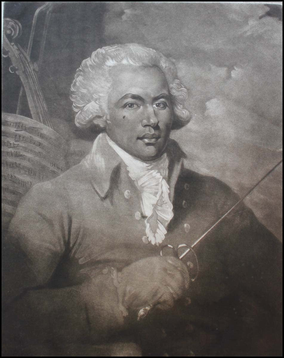 Boulogne, Joseph. [St. George, Chevalier de.](1745 - 1799). Mezzotint Portrait. Very rare original lifetime portrait of the important composer, conductor, and violinist in the Paris musical scene in the second half of the 18th century. Prior to the revolution in France, he was also famous as a swordsman and equestrian. Known as the "black Mozart" he was one of the earliest musicians of the European classical type known to have African ancestry.