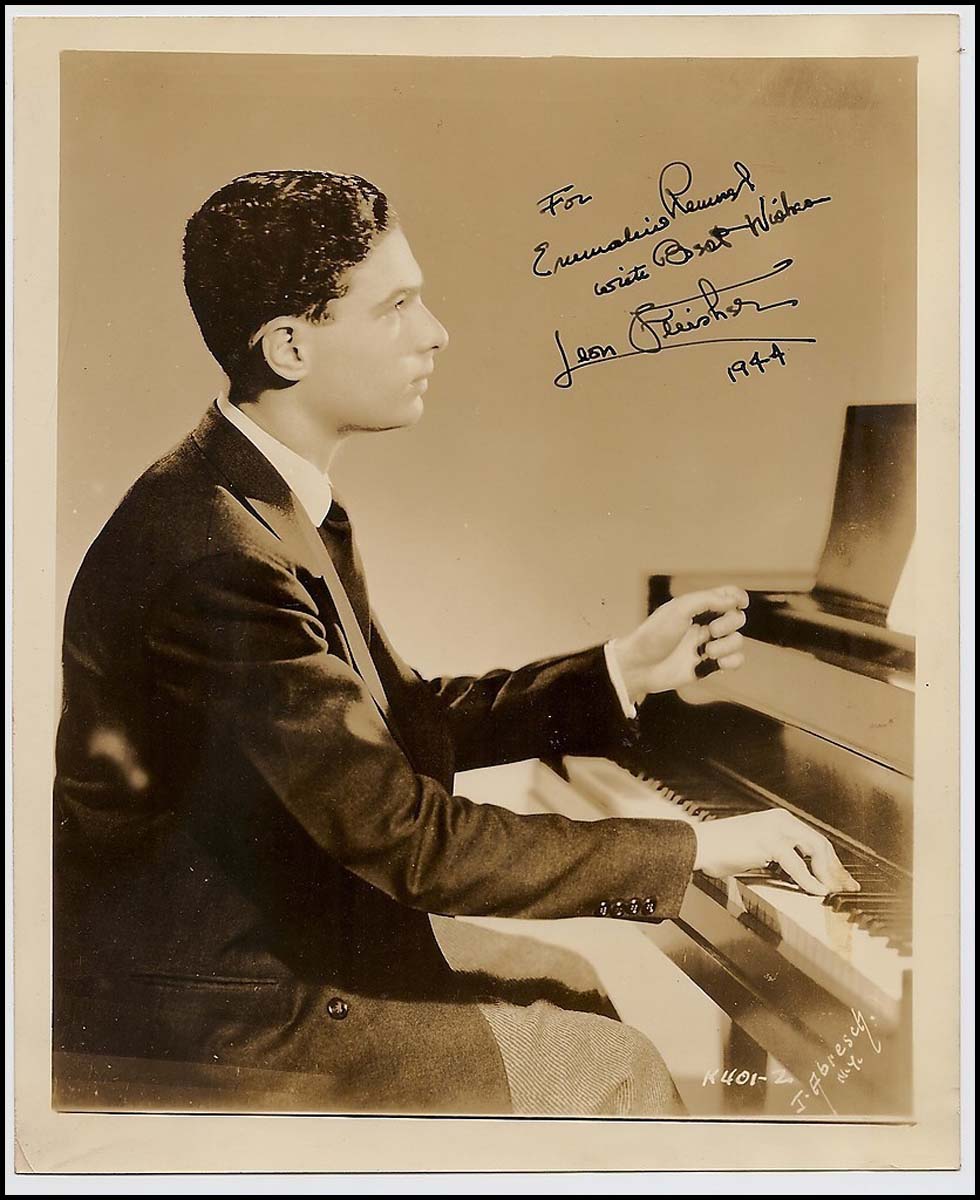 Fleisher, Leon. (1928–2020). Early Signed Photograph. A scarce early J. Abresch of NY photograph of the superb pianist at the keyboard, boldly signed and inscribed in black ink at age 16, the year of his debut under Pierre Monteux with the New York Philharmonic, after which the conductor called him "the pianistic find of the century."