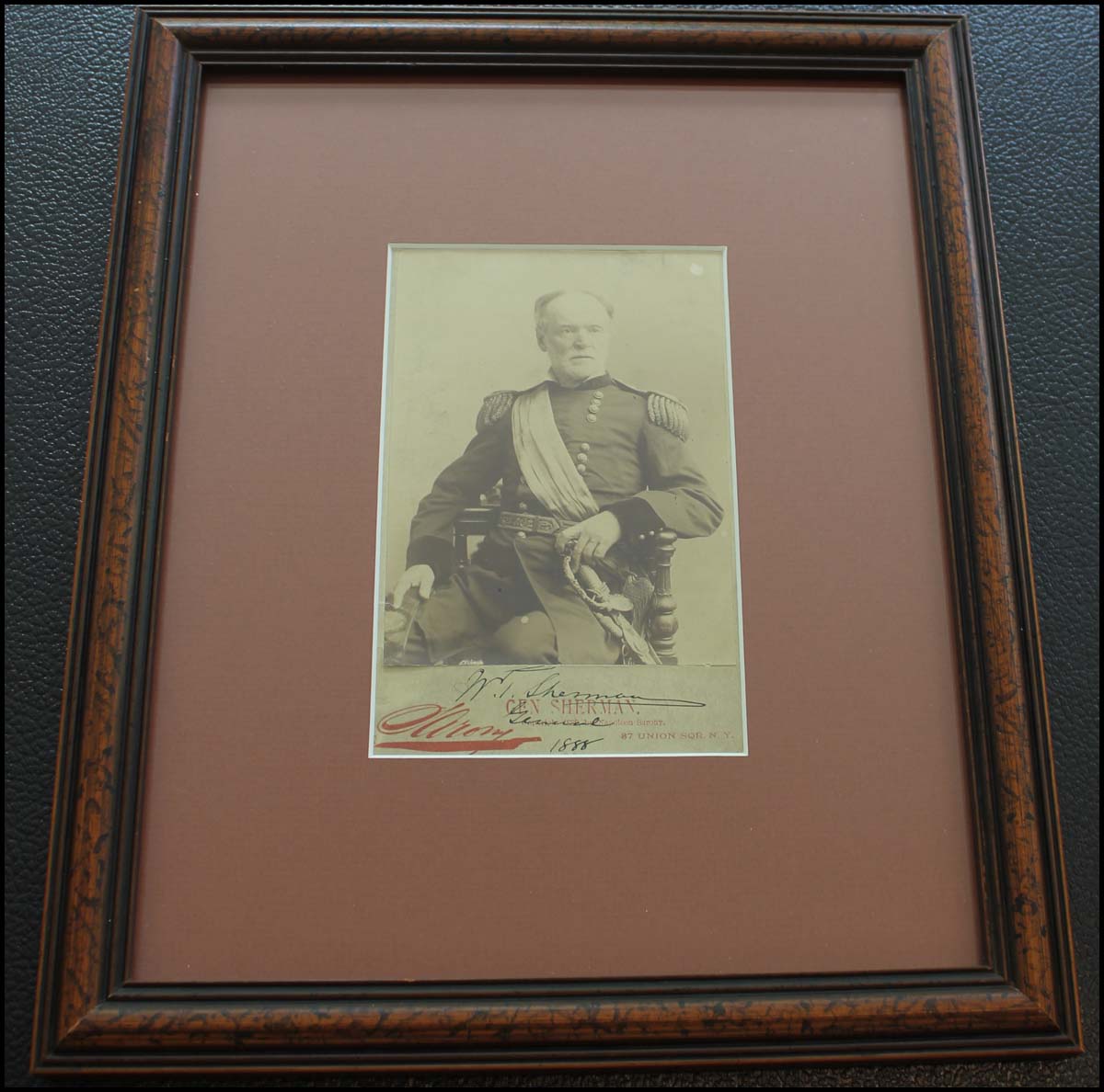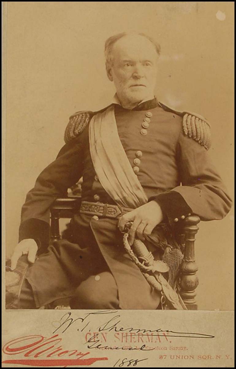 [History & Science] Sherman, William T. (1820 - 1891). Signed Photograph. Stupendous Sarony cabinet photograph of a seated Sherman in uniform, 4 x 6.25, signed on the original photographer’s mount, “W. T. Sherman, General, 1888.” Matted and framed to an overall size of 11 x 13 inches. In fine condition.