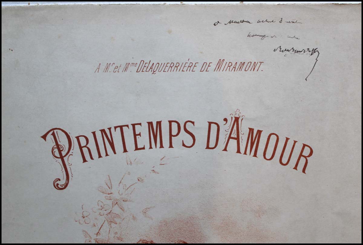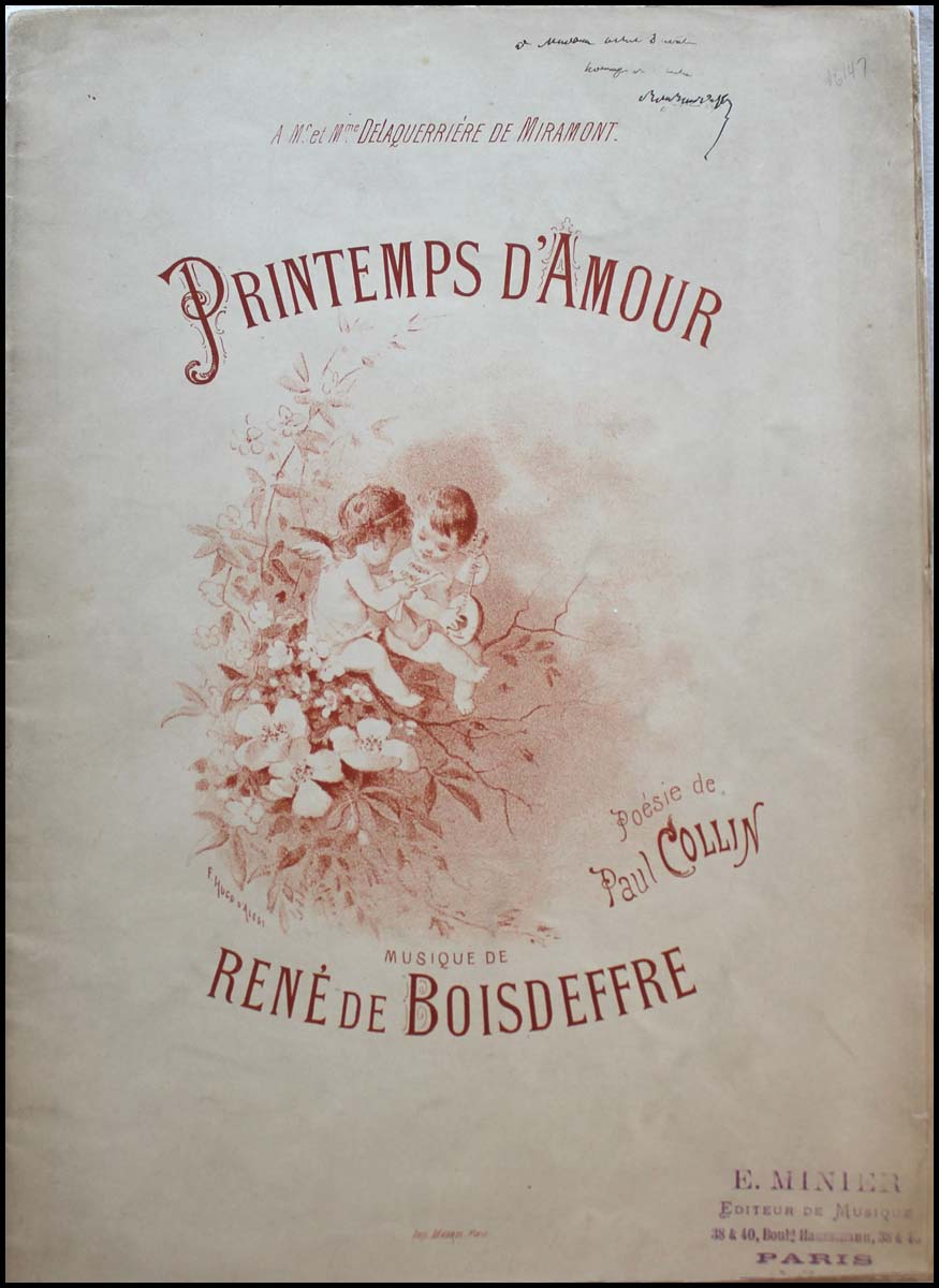 Boisdeffre, René de. (1838 - 1906). Printemps d'Amour. Opus 23 - SIGNED. Paris: Maurel. 1882. First edition. 5 songs for voice and piano, poetry by Paul Collin. 25 pp. [PN] 1837. Signed and inscribed in the composer's diminutive hand on the front cover, upper right corner. Restored and archivally bound in simple gray boards. Fine.