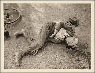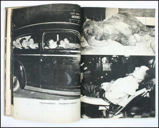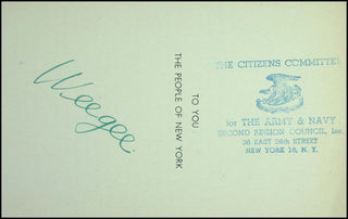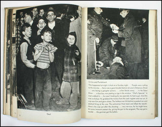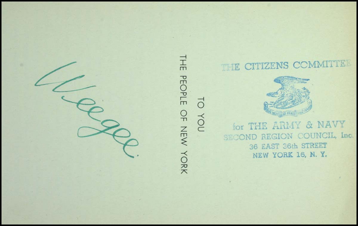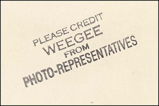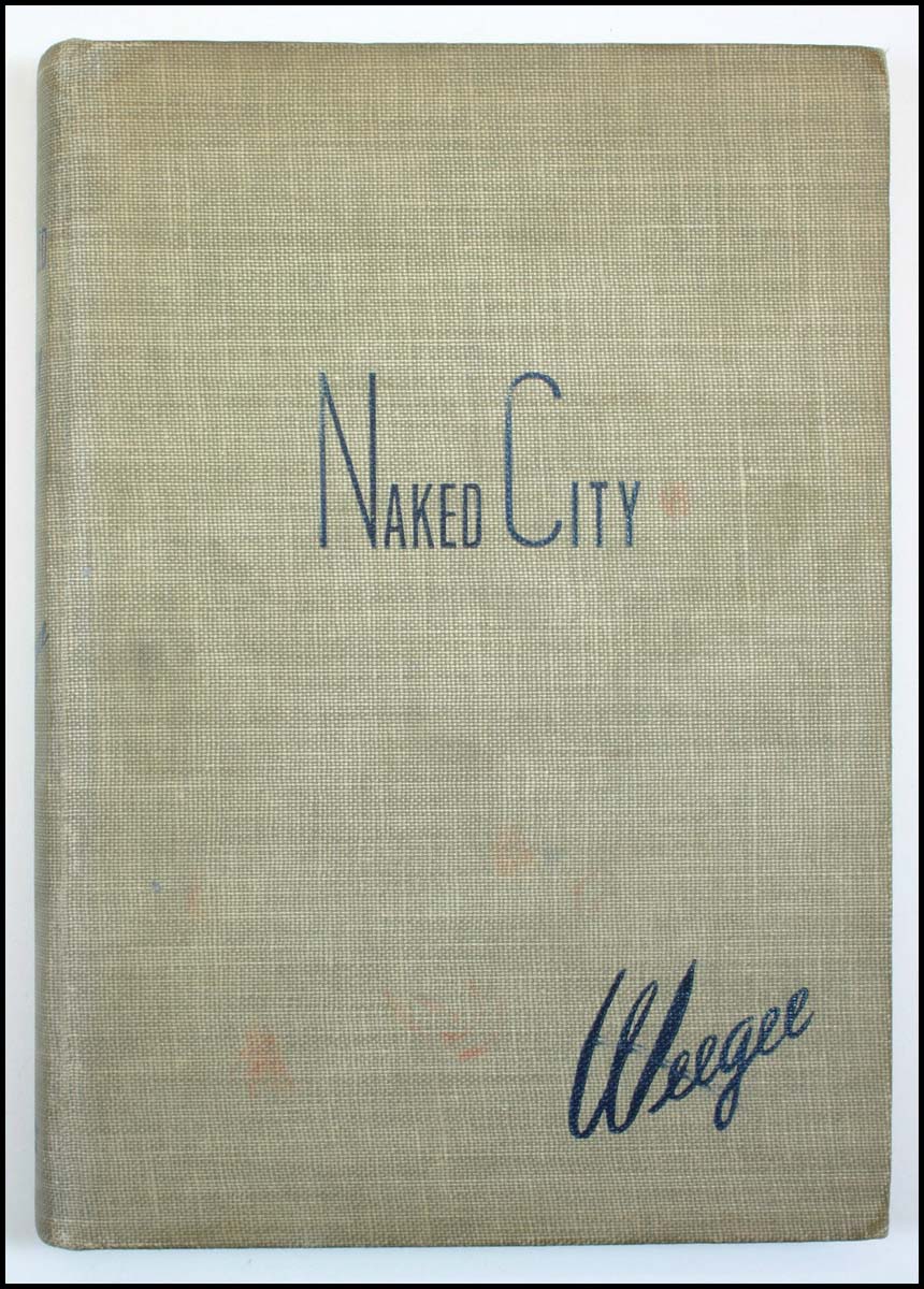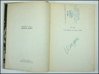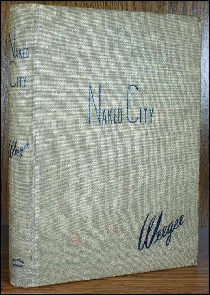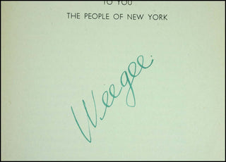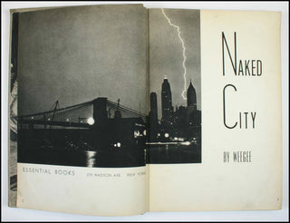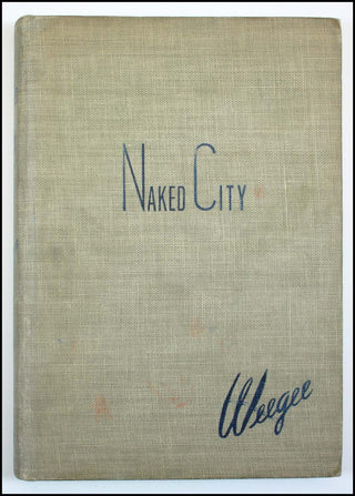 [Literature & Art] ["Weegee"] Fellig, Arthur. (1899 - 1968). NAKED CITY - SIGNED, with an Original Photograph. New York: Essential Books. 1945. First edition. First edition, in the earlier binding of rough textured buckram. Boldly signed by Weegee in green ink on the dedication page. Large ownership rubber-stamp of the “Citizen’s Committee for the Army & Navy…” on the dedication page, general wear and moderate soiling on the covers, several pages have small stains but overall a solid, very good copy, very scarce signed. Together with and untitled and apparently unpublished silver gelatin photograph, 7 3/4 x 10 in., a New York City accident or crime scene with a man crumpled upon the pavement, suffering from what appears to have been a fatal head injury. Inkstamp on verso: "Please Credit Weegee From Photo-Representatives." Fine condition. A fine and characteristic original print from the photographer and photojournalist known for his stark black and white street photography.