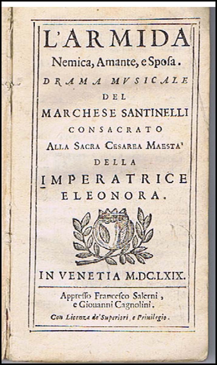 "This five-act dramma musicale is survived by a libretto calling for a prologue and baletto in addition to its acts. The libretto was dedicated to the Empress Eleonora on 19 December 1668; the title-page is dated 1669. Composer unknown, text by Francesco Maria Santinelli, who in his dedication recommends the 'royal damsel' who is his subject to the empress."