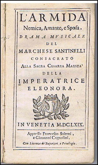 [Early Opera] Santinelli, Francesco Maria. (1627 - 1697). Armida nemica, amante, e sposa [Armide - Enemy, Lover, and Wife] - LIBRETTO. Venitia: Appresso F. Salerni, e G. Cagnolini. 1669. 120 pp. Engraved throughout with elaborate title illustration, head and tail-pieces. Galvani App 2,20; Alm 164, 165. OCLC locates 4 copies worldwide.