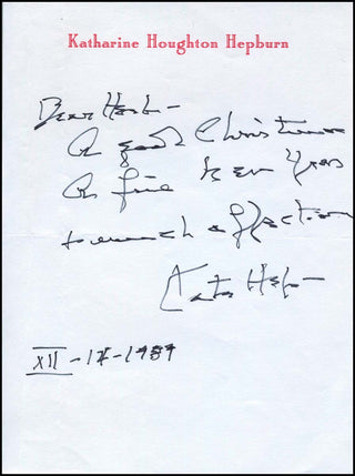 A nice signed holiday letter from the great American actress and Academy Award winner. 1p. 8vo. ALS signed “Kate Hep,” one page, 7.25 x 10, personal letterhead, XII-14-1989. To Herb, in full: “A good Christmas. A fine New Year + much affection.” In fine condition, with intersecting folds and creases.
