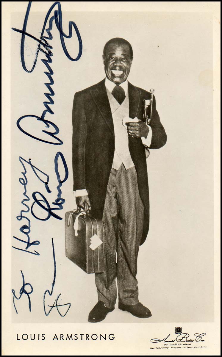 Vintage glossy publicity postcard photograph of the great Satchmo with his trumpet tucked under his arm and carrying a valise, boldly signed and inscribed in black ink and in very fine condition. 3.5 x 5.5 inches.