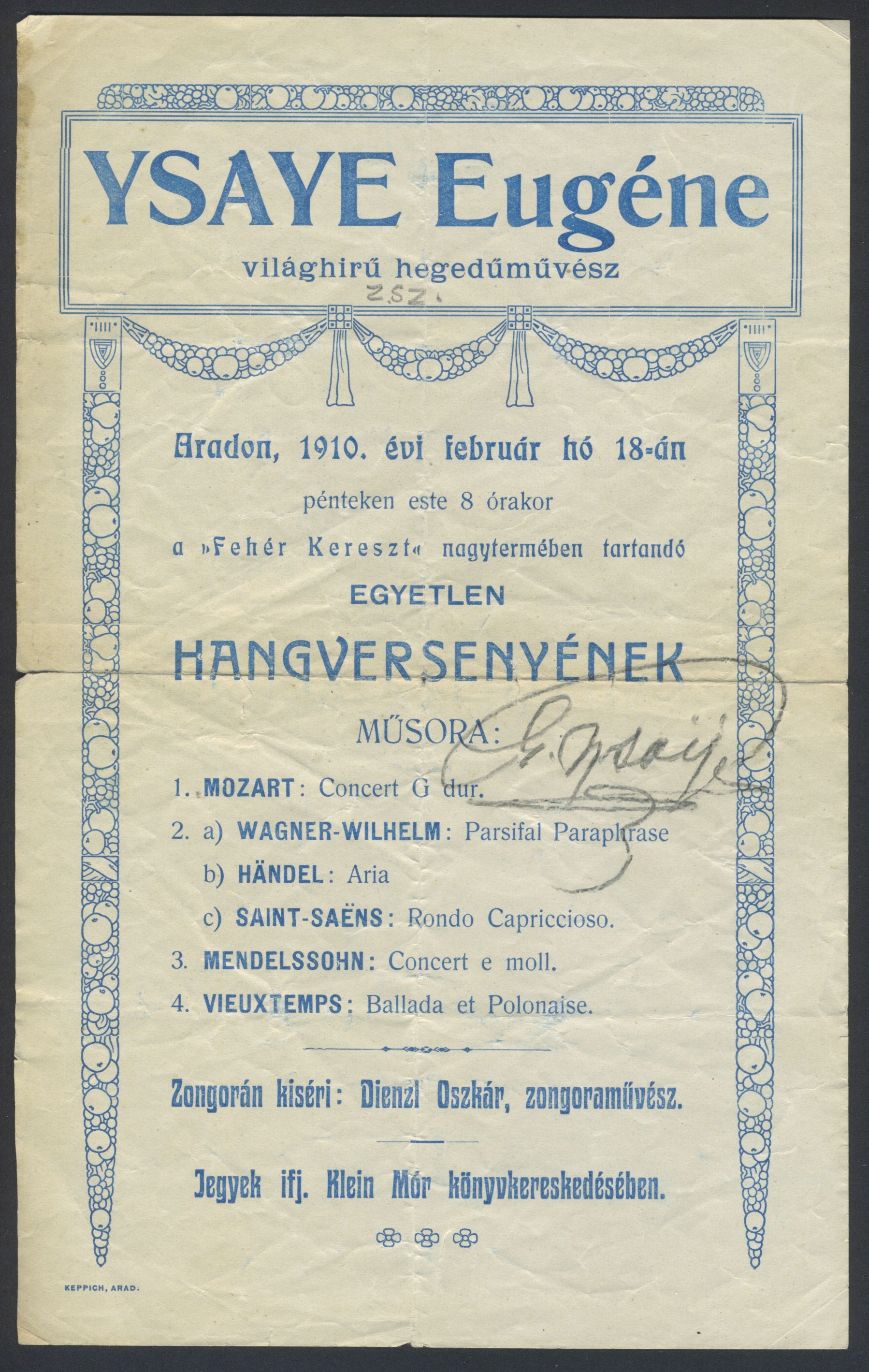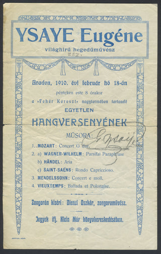 Ysaye, Eugene. (1858–1931). Signed 1910 Hungarian Playbill. Rare early program signed in pencil by the great fiddler. Arad, 18. 2. 1910. 230 x 145 mm. Folded, one 4 cm long tear along crease, generally worn but very attractive nevertheless.