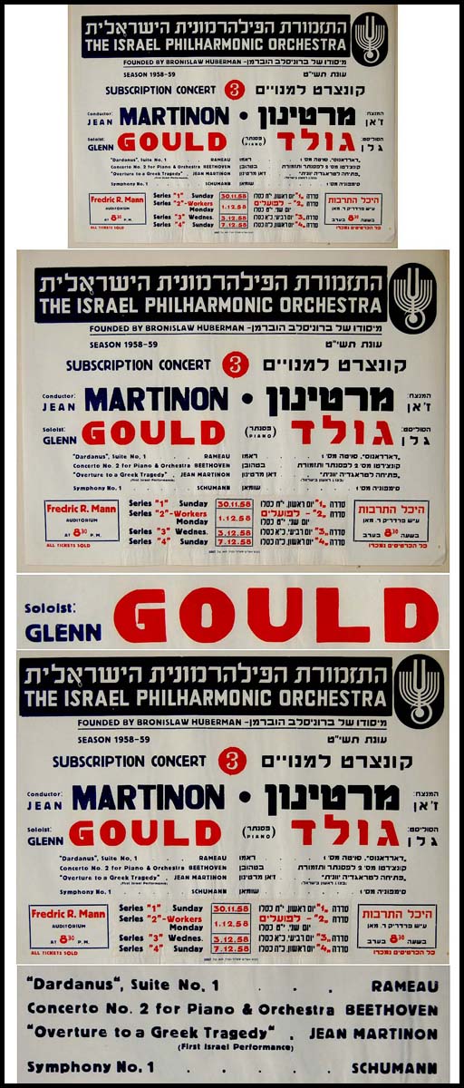 Gould, Glenn. (1932-1982). 1958 Israel Concert Poster. Original 1958 concert poster from a 1958 performance by the 26-year-old pianist of the Beethoven 2nd Piano Concerto with the Israel Philharmonic under the baton of Jean Martinon. Printed in red and blue on white paper, 27 x 19 inches. In good condition.