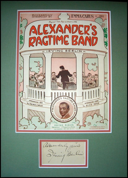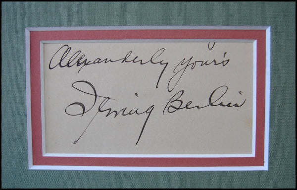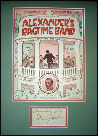 From one of America’s greatest songwriters. Vintage fountain pen signature, “Alexanderly yours, Irving Berlin,” on an off-white 5 x 6.5 album page. In fine condition, with light toning, trimmed top edge, and a couple small dings to right edge. Elegantly double-matted with a 1938 copy of Berlin's famous song "Alexander's Ragtime Band," with a vignette portrait of the composer where that of Emma Carus had originally appeared in 1911.