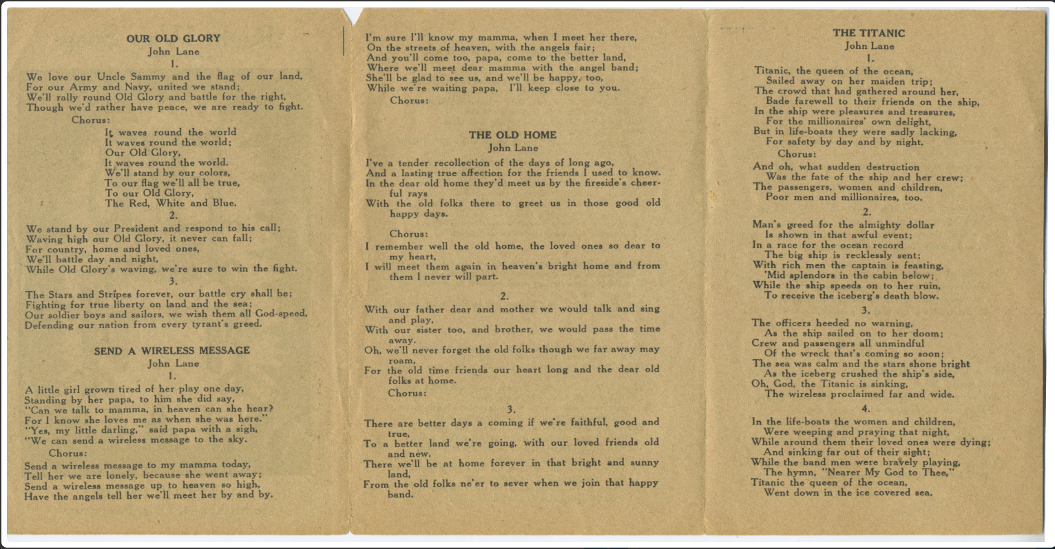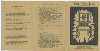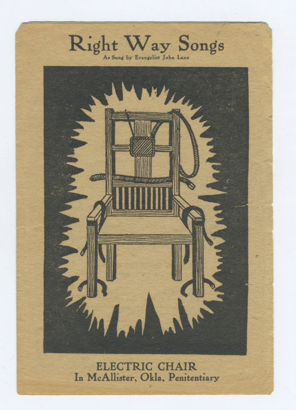Single sheet double-fold, 12 x 6 inches. Dramatic title panel with bold graphic of "Electric Chair in McAllister [sic], Okla, Penitentiary." This strange little volume contains six songs, five by Lane - "Our Old Gloy," "Send A Wireless Message," "The Old Home," "The Titanic," "The White Slave," and "The Baggage Care Ahead."