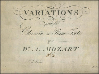Mozart, Wolfgang Amadeus. (1756–1791). Variations pour le Clavecin ou Piano Forte. [K. 353]. Vienne: [Artaria & Co.]. [1801]. First edition, 6th issue. Air and 12 Variations on "La Belle Francoise." Oblong folio. Title, 8 pp. Engraved throughout. [PN] 87. All but the title and first page printed from the plates of the first issue. Haberkamp p. 151: "Die platten waren 1801 an Carlo Artaria übergegangen, der das Werk aufgrund der alten platten neu auflegte. Titel un s.1 sing dabei neu gestochen...In beiden eingesehenen Exemplaren sind die VN links und der Preis auf der Titelseite kaum erkennbar, möglicherweise getilgt"). "No: 2." written in ink on the title page, the original printed price "40X -" still visible lower right, "A Vienne" remaining, but the rest of the publisher's imprint wiped out (as described in Haberkamp). In fine condition, an excellent wide-margined copy, contained in an attractive marble paper folder.
