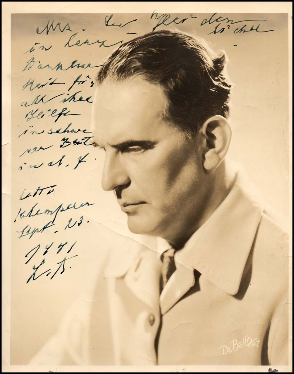 Klemperer, Otto. (1885–1973). Signed Photograph. Signed 8 x 10 inch sepia De Bellis photograph the German-born conductor and composer. Though best known as one of the twentieth century’s greatest interpreters of the core German repertoire, he also premiered important works by the likes of Janácek, Stravinsky, and Schönberg. With a lengthy inscription dated L.A. Sept. 23, 1941. Small tears to margins, a number of creases both large and small, mounting remnants on verso. Nevertheless, a boldly signed and inscribed example, especially rare in signed photographs from this period.