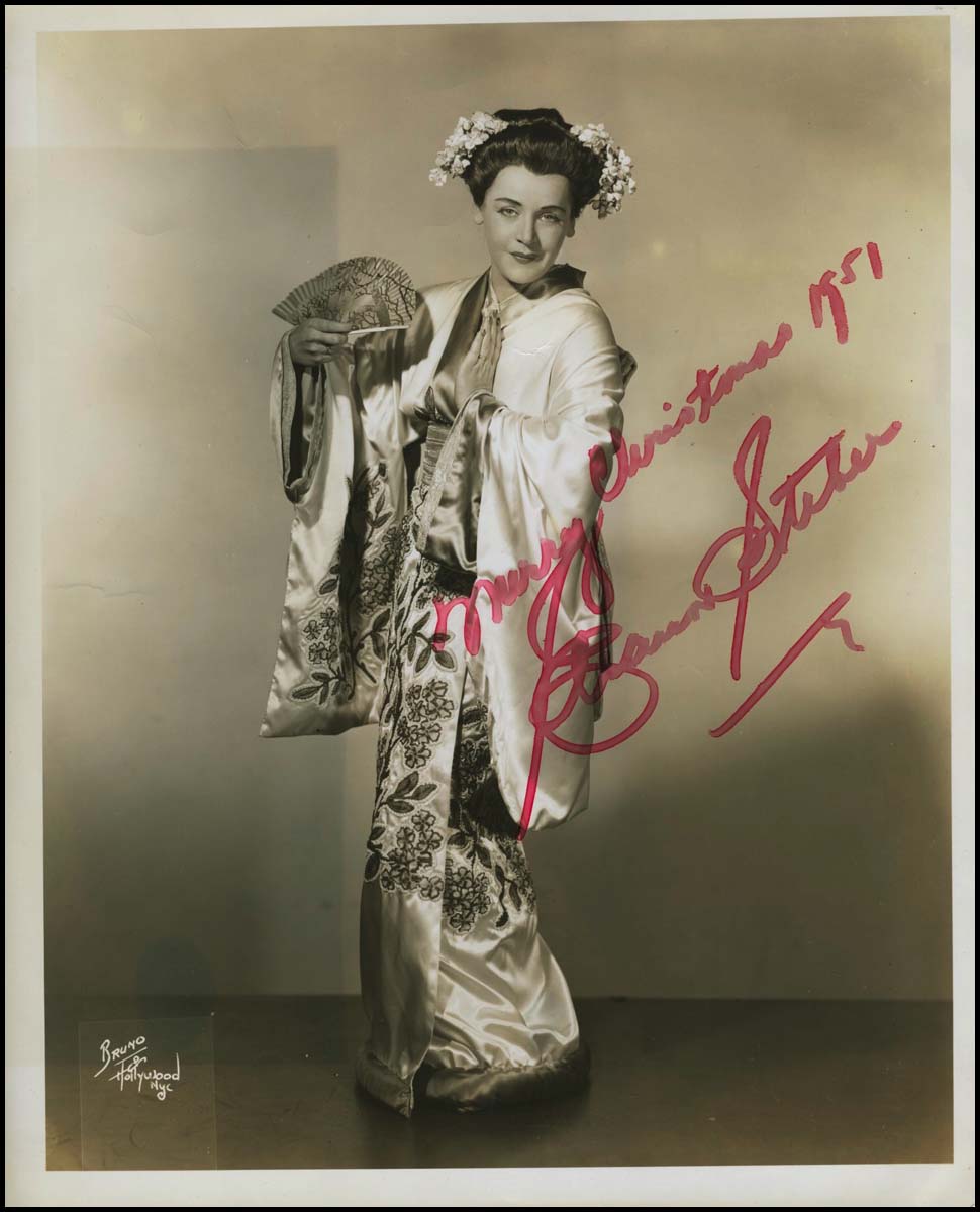 Signed photograph from the American soprano, a popular star at the Metropolitan who also sang the world premiere in 1948 of Samuel Barber's Knoxville, Summer of 1915, a work which she commissioned. Glossy sepia Bruno of Hollywood photograph of Steber as Madam Butterfly, boldly signed in red ink "Merry Christmas 1951 / Eleanor Steber." Fine.