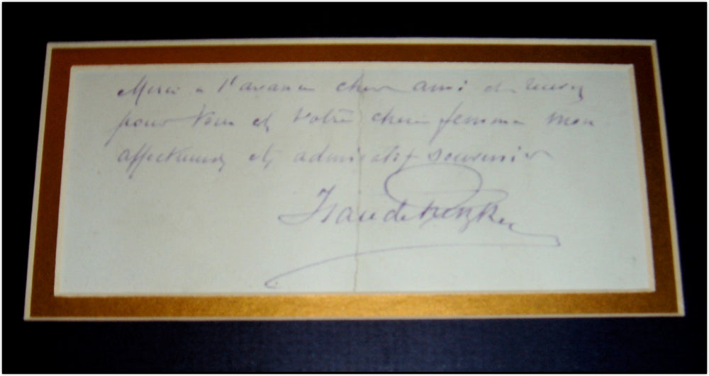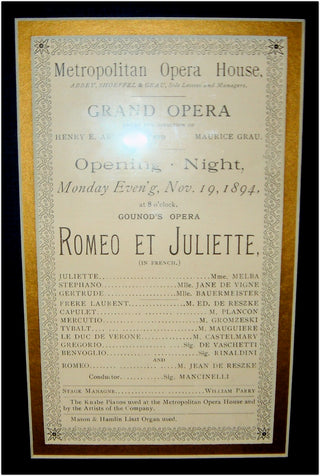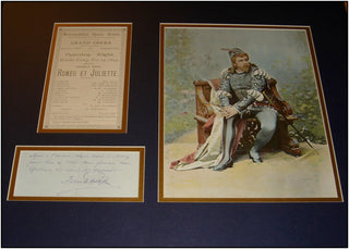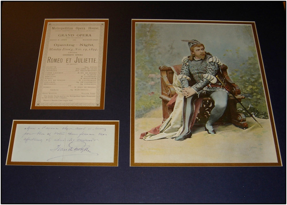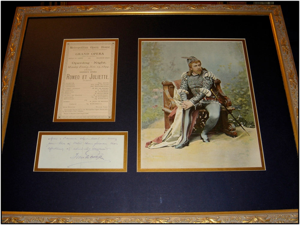 De Reszke, Jean. (1850 - 1925). Stunning framed Ensemble, "Romeo et Juliette." . Fine autographed letter, nicely matted and framed with an 1894 MET "Romeo And Juliet" program and fine color lithograph portrait as Romeo.