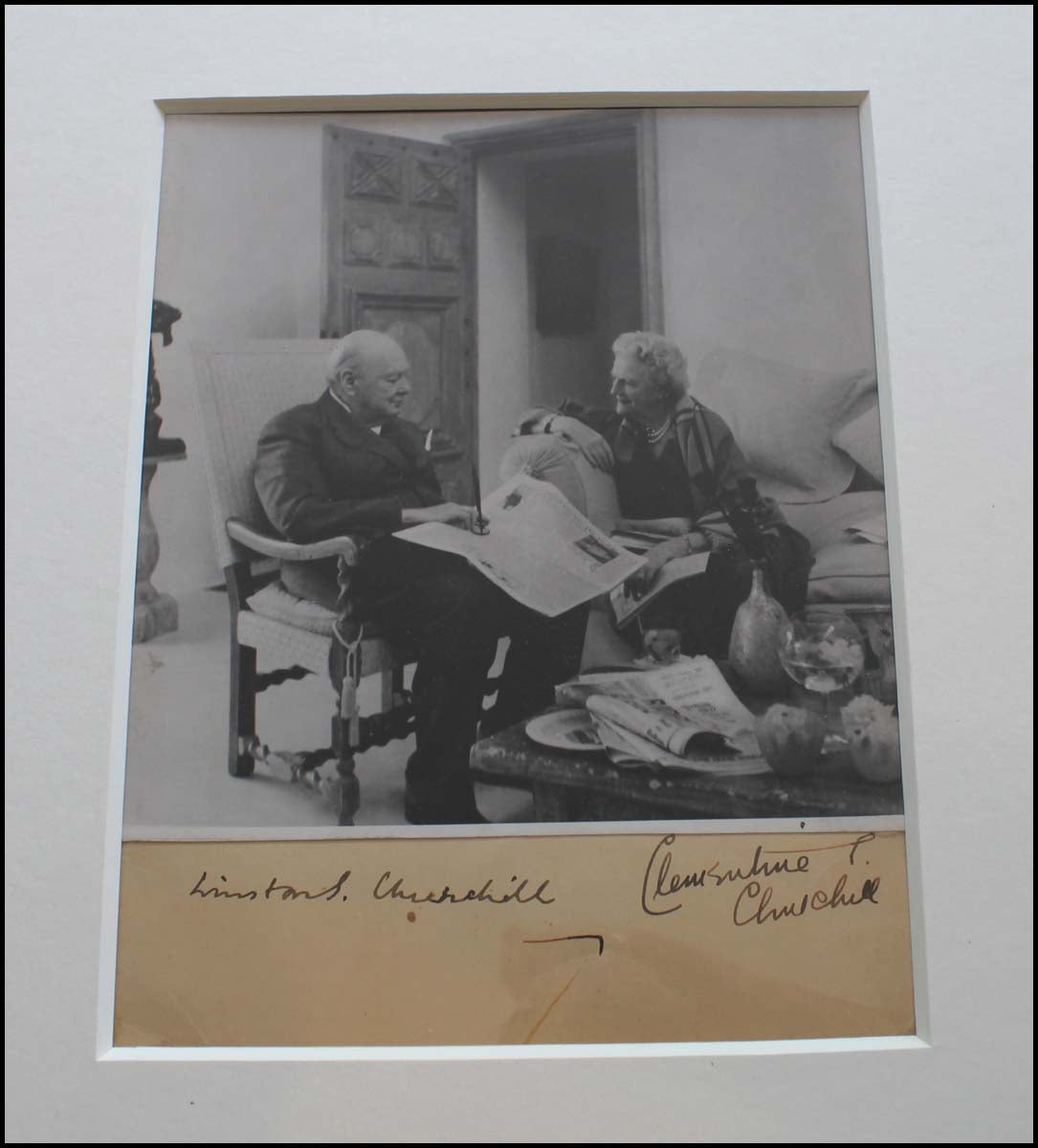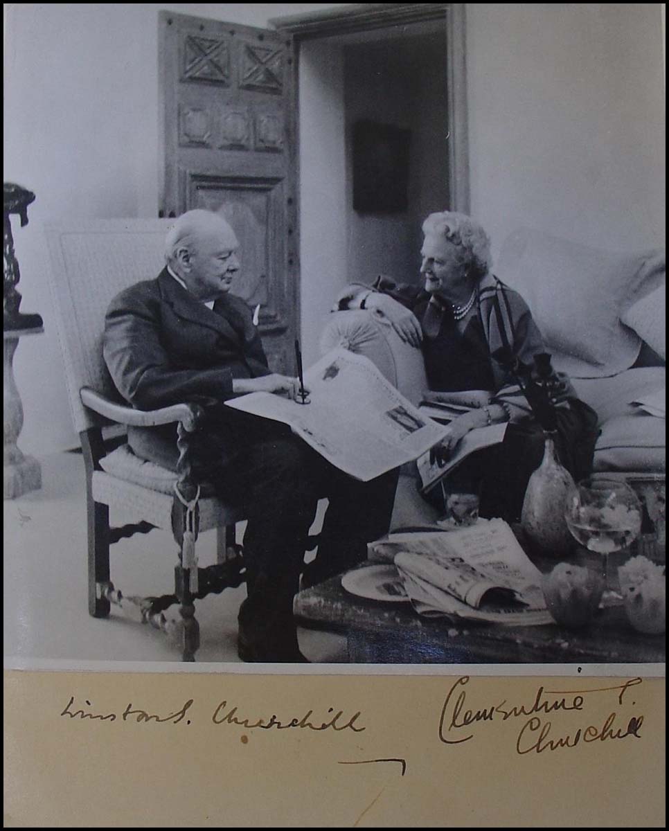 [History & Science] Churchill, Winston. (1874–1965). Signed Photograph. Vintage photograph of Sir Winston L. S. Churchill and Clementine Churchill, showing them together in a drawing room on the occasion of their fiftieth wedding anniversary (1958). Signed by both on the mount beneath the silver print, 15.7 x 15.7 cm.