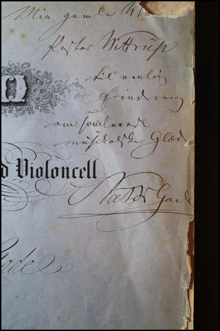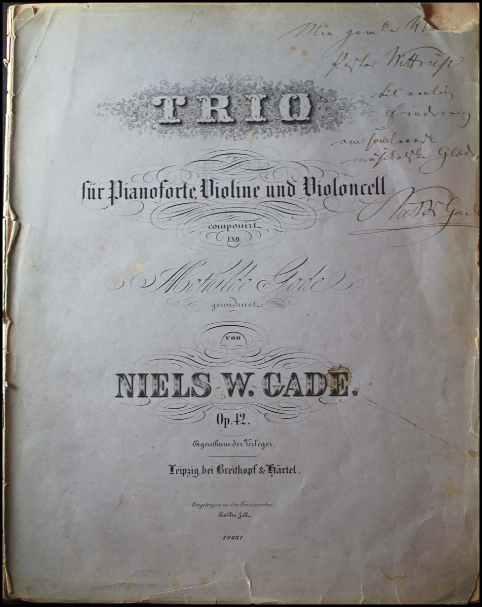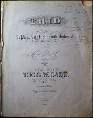 Gade, Niels. (1817 - 1890). Trio für Pianoforte, Violine und Violoncell... Op. 42. - SIGNED. Leipzig: Breitkopf & Härtel. [1864]. Piano score. 35 pp. [PN] 10631. Inscribed and signed on the front wrapper, in Danish, to a pastor Wittrup, signed "Niels W. Gade." Chipped around edges, upper right corner perished affecting one word of inscription, rear wrapper lost, otherwise very good throughout.