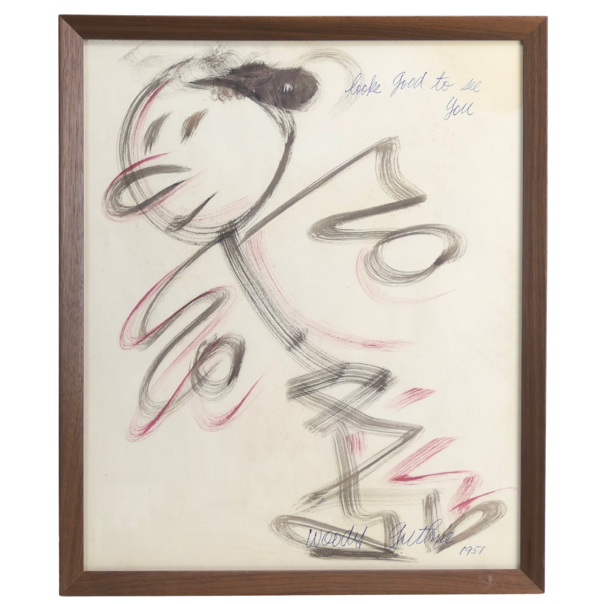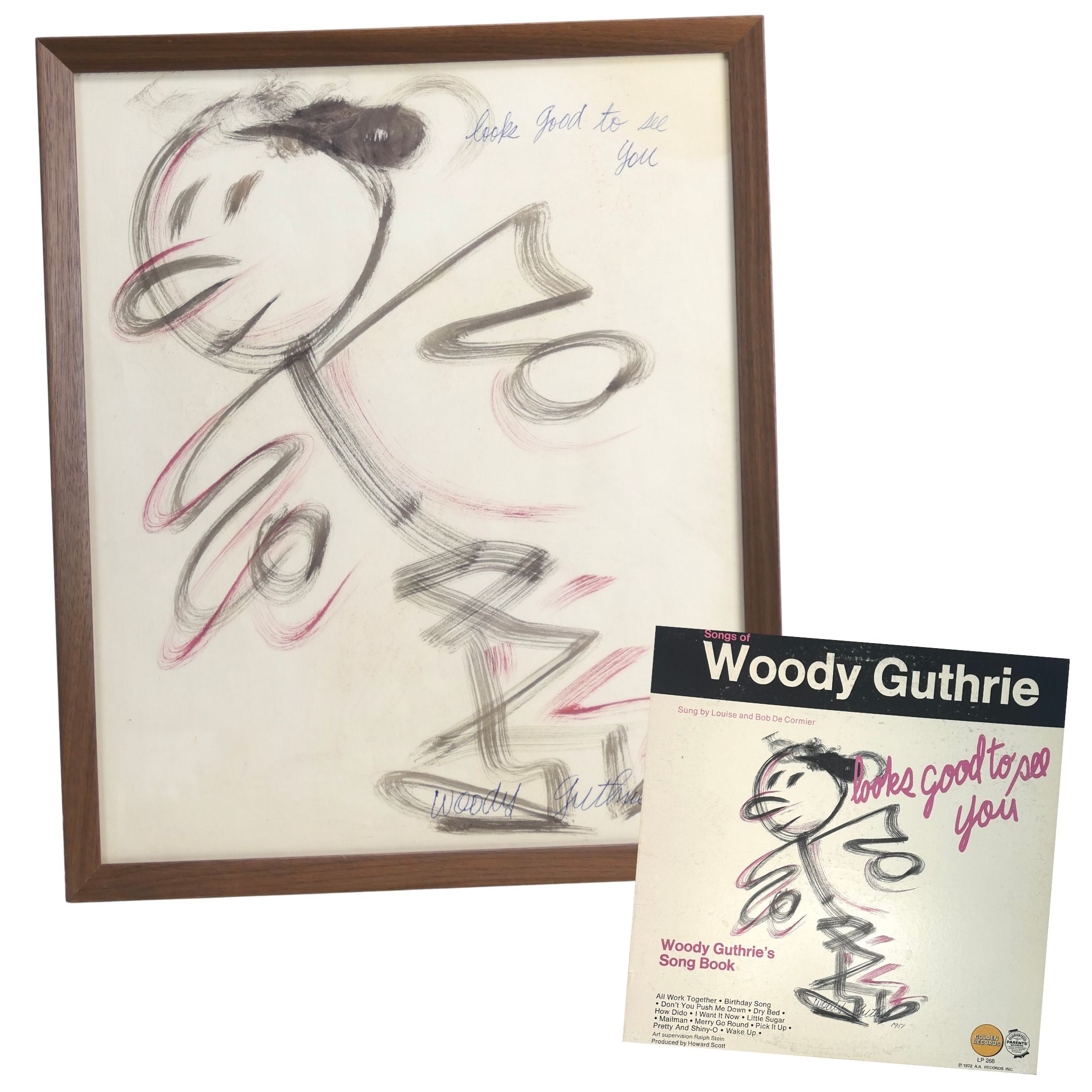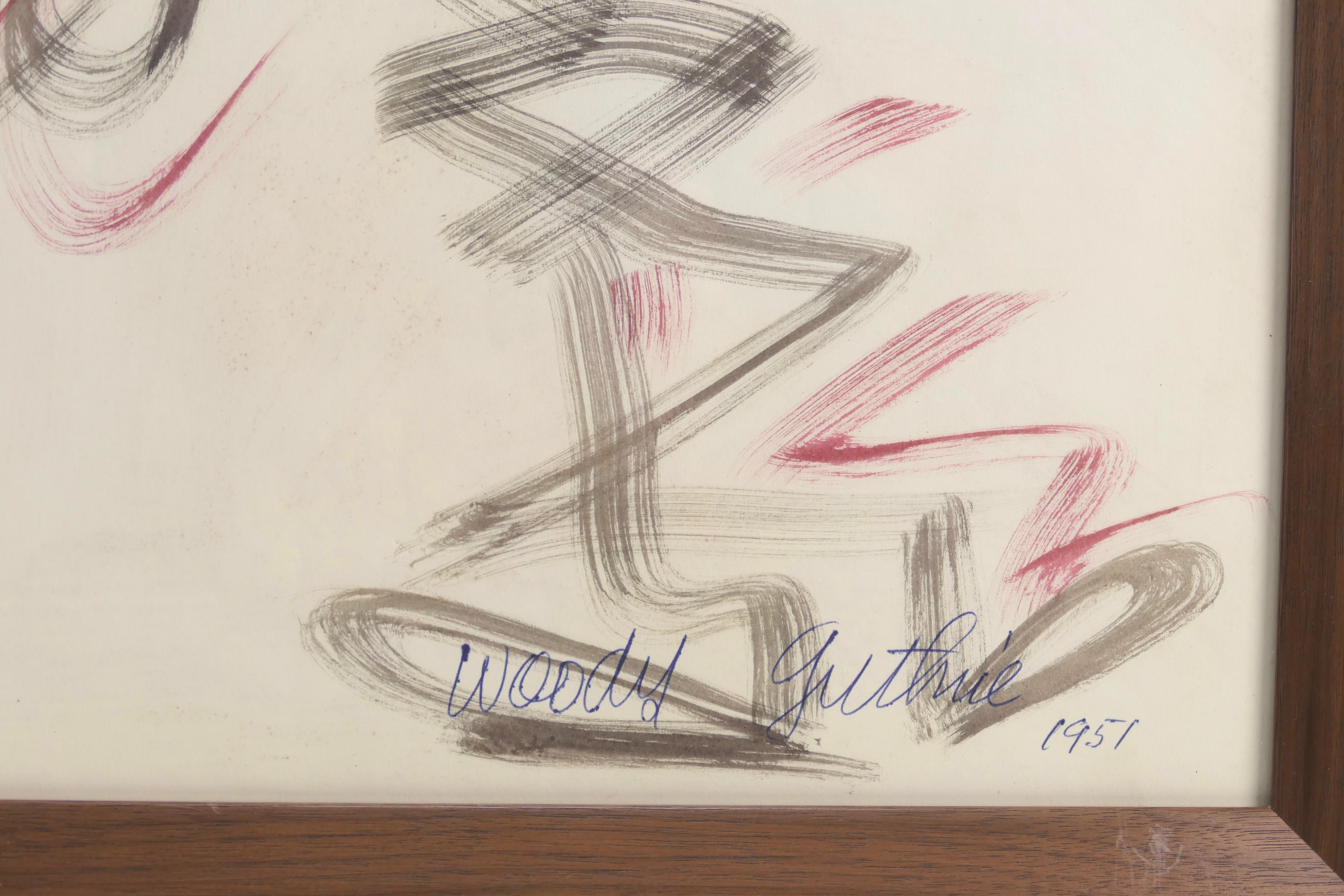 Large original brush-and-ink painting by the legendary and influential troubador and artist, illustrating his song "So Long, It's Been Good To Know You," playfully adapted here as "Looks good to see you." Accomplished in ink and watercolor, signed and dated 1951 lower right and titled upper right in blue ink, from spiral sketch pad. 14 x 17 inches, nicely framed under UV plexi in a new wood frame. Sold together with a 1972 33 1/3 rpm LP record (Golden LP-268), a collection of Woody's childrens songs as sung by Louise and Bob De Cormier, titled "Looks Good To See You" and featuring a reproduction of this artwork on the cover.