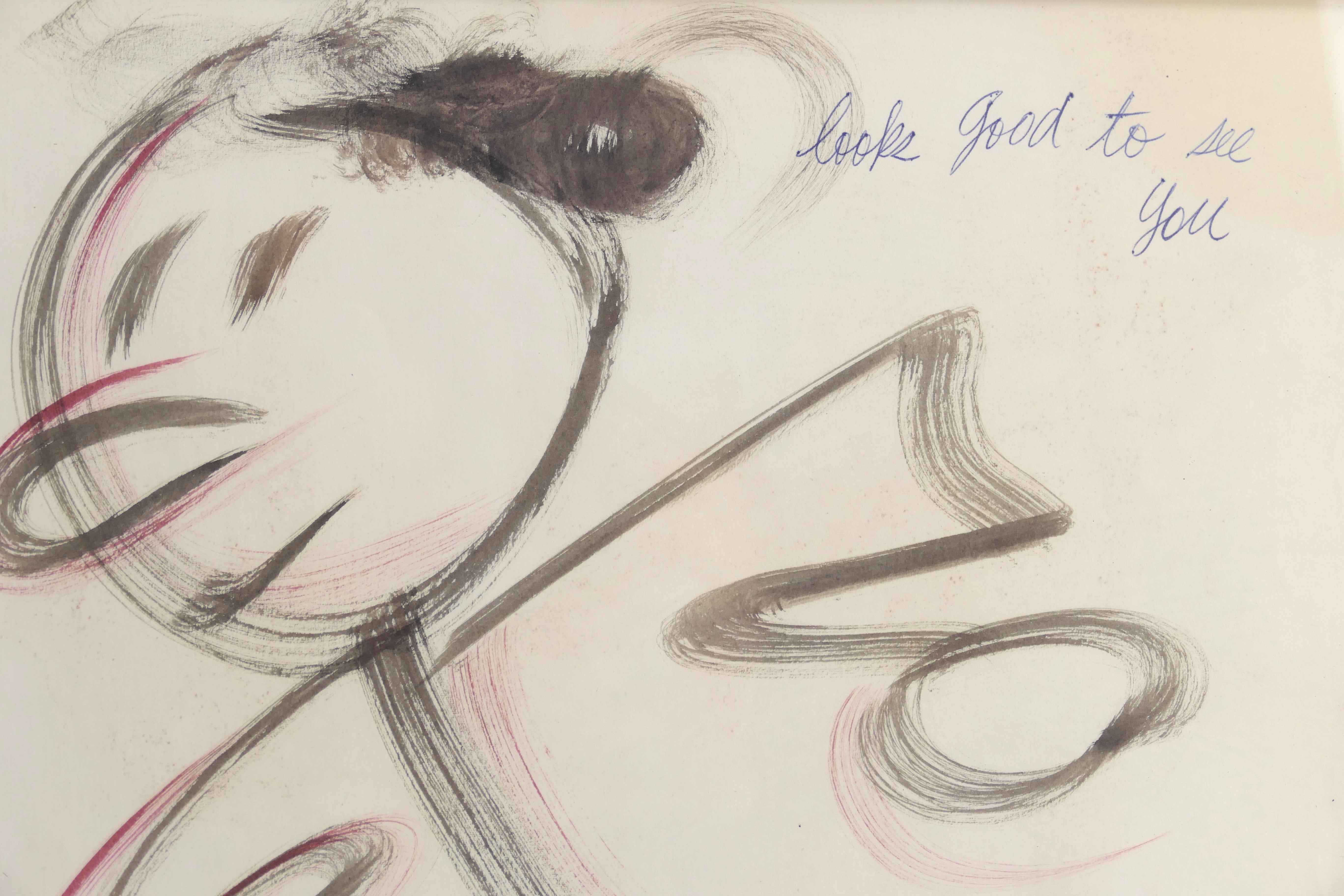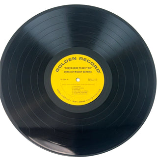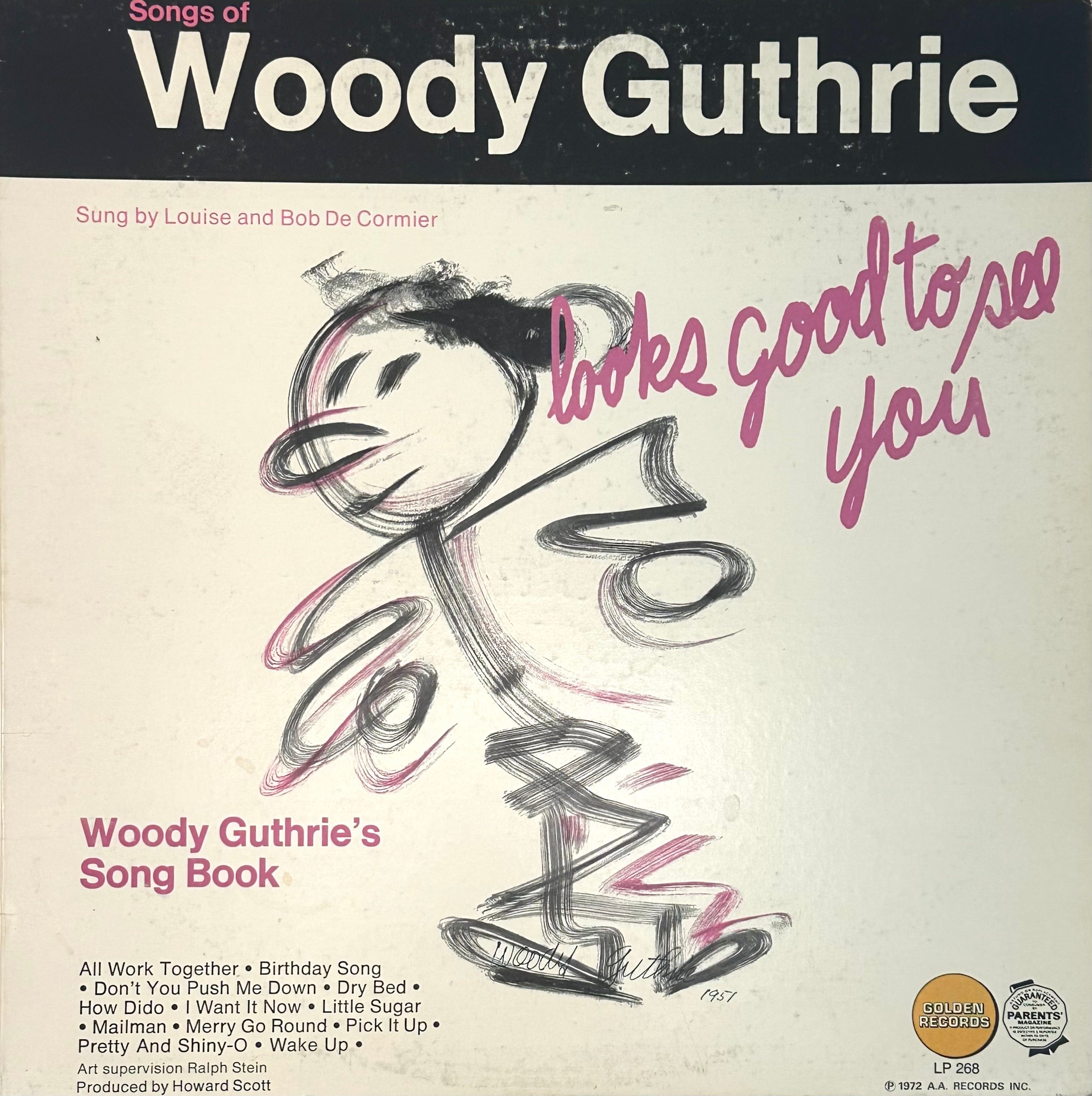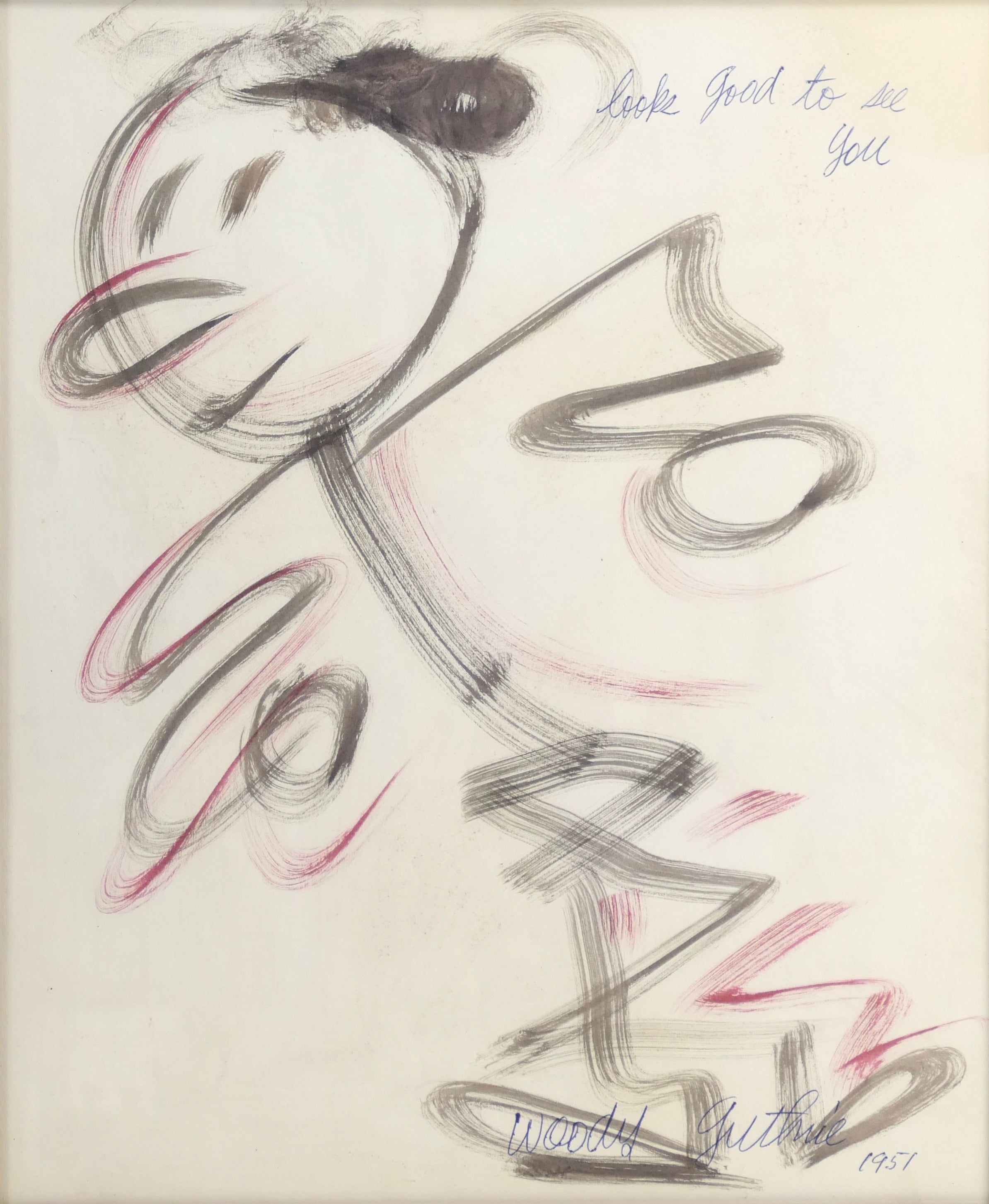 Large original brush-and-ink painting by the legendary and influential troubador and artist, illustrating his song "So Long, It's Been Good To Know You," playfully adapted here as "Looks good to see you." Accomplished in ink and watercolor, signed and dated 1951 lower right and titled upper right in blue ink, from spiral sketch pad. 14 x 17 inches, nicely framed under UV plexi in a new wood frame. Sold together with a 1972 33 1/3 rpm LP record (Golden LP-268), a collection of Woody's childrens songs as sung by Louise and Bob De Cormier, titled "Looks Good To See You" and featuring a reproduction of this artwork on the cover.