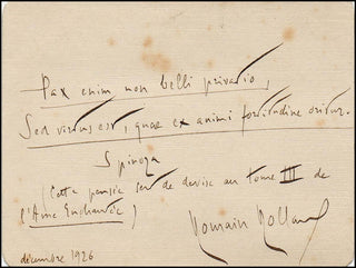 [Literature & Visual Arts] Rolland, Romain. (1866 - 1944). Autograph Signed Quotation. Autograph quotation in Latin from the French writer who won the 1915 Nobel Prize for literature. Two lines in Latin, "Pax enim non belli privatio, sed virtus est, quae ex animi fortitudine oritur" ["Peace is not an absence of war, it is a virtue, a state of mind, a disposition for benevolence, confidence, justice"], identified by Rolland as from Spinoza, and inscribed with a note in French, "This thought will serve as an epigraph to Volume III of "The Enchanted Soul / Romain Rolland." On a rigid card, 11.5 x 9 cm, December 1926. A few spots of foxing, some related clippings affixed to the verso.