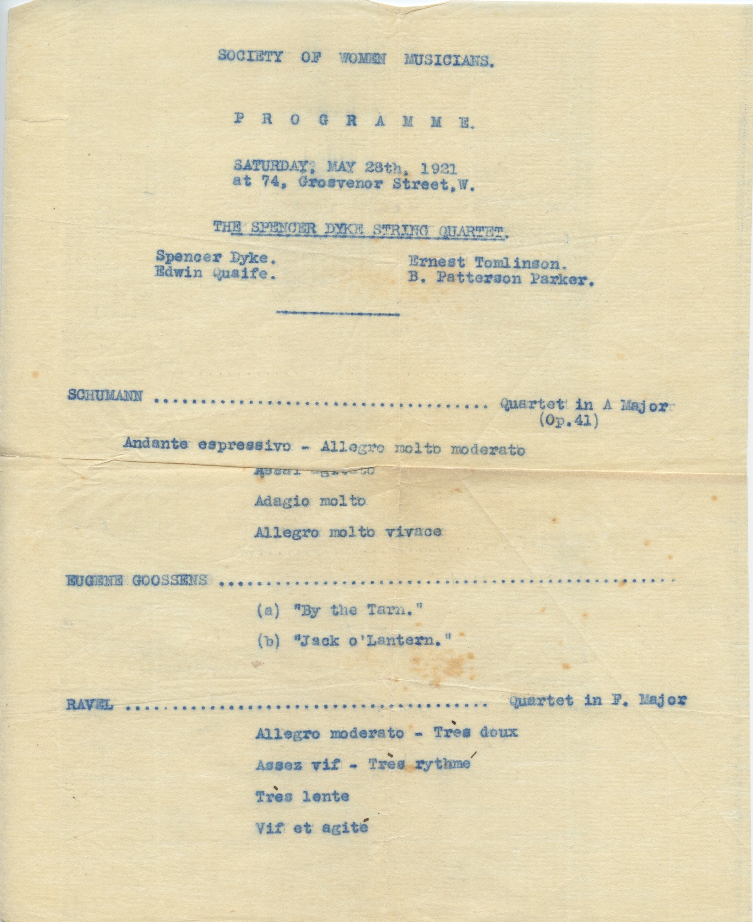Sold together with another Society Of Women Musicians programme, typewritten on thin carbon paper. This programme is dated, May 28th, 1921, and featuring The Spencer Dyke String Quartet. Some creases to both, condition generally fine.