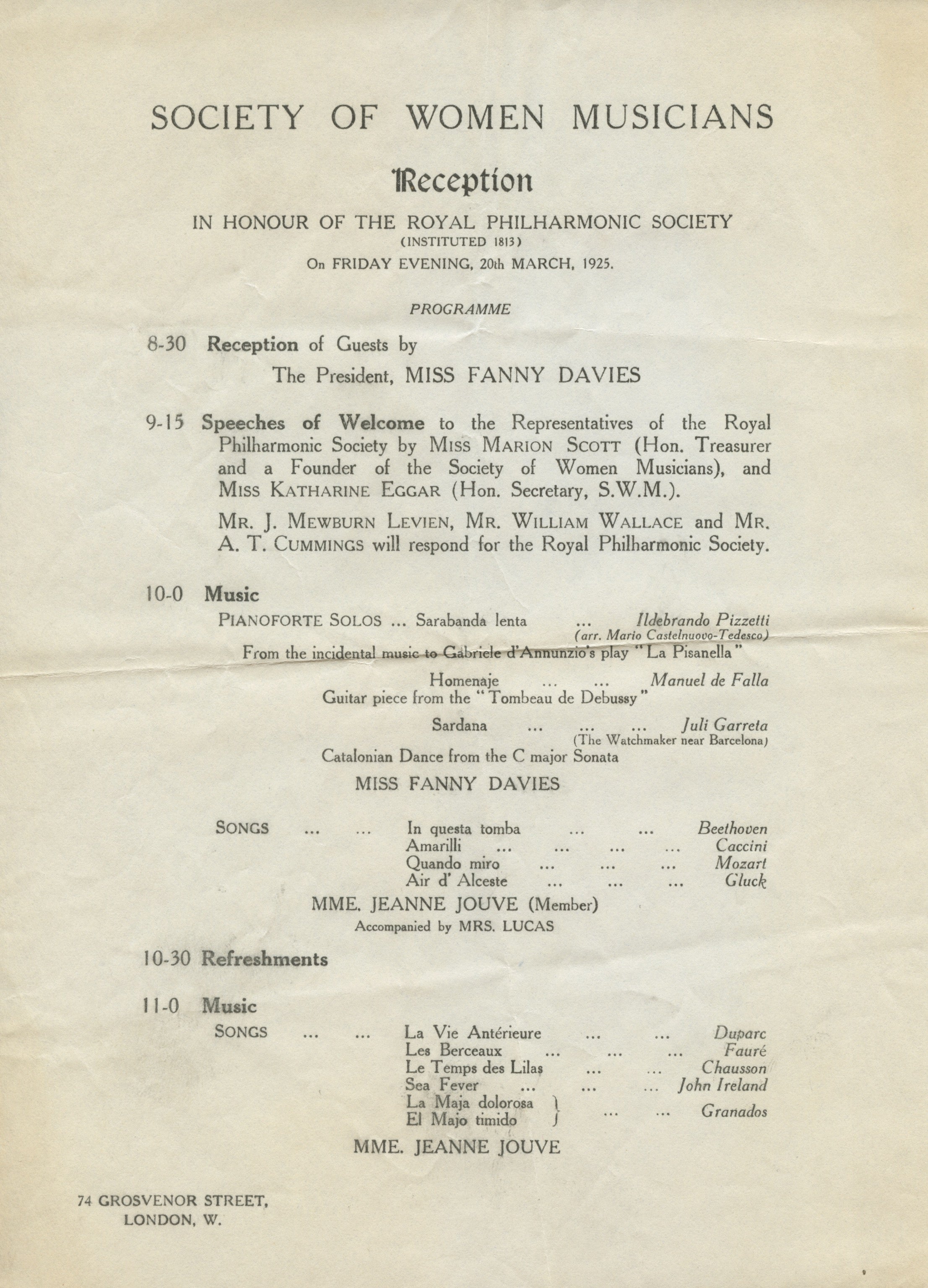 [Society of Women Musicians] [Davies, Fanny. (1861 - 1934)]. 1925 "Society of Women Musicians" Recital Program. Single sheet program from a performance featuring Miss Fanny Davies and Mme. Jeanne Jouve in a pianoforte recital at 74 Grosvenor Street, in London, on March 20th, 1925. 8 x 10 inches (20 x 25 cm).