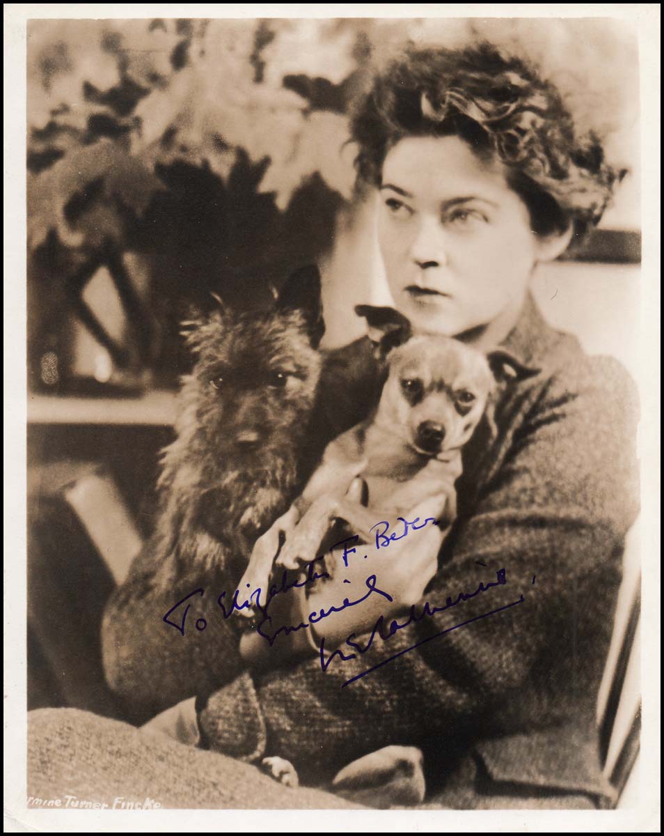 Striking 8 x 10 inch doubleweight Fincke portrait photograph boldly signed and inscribed in purple ink by the influential actress, producer, and director who was a lover of Alla Nazimova and Tallulah Bankhead as well as of Basil Rathbone. The actress is shown holding her two dogs and staring intensely! In very fine condition.