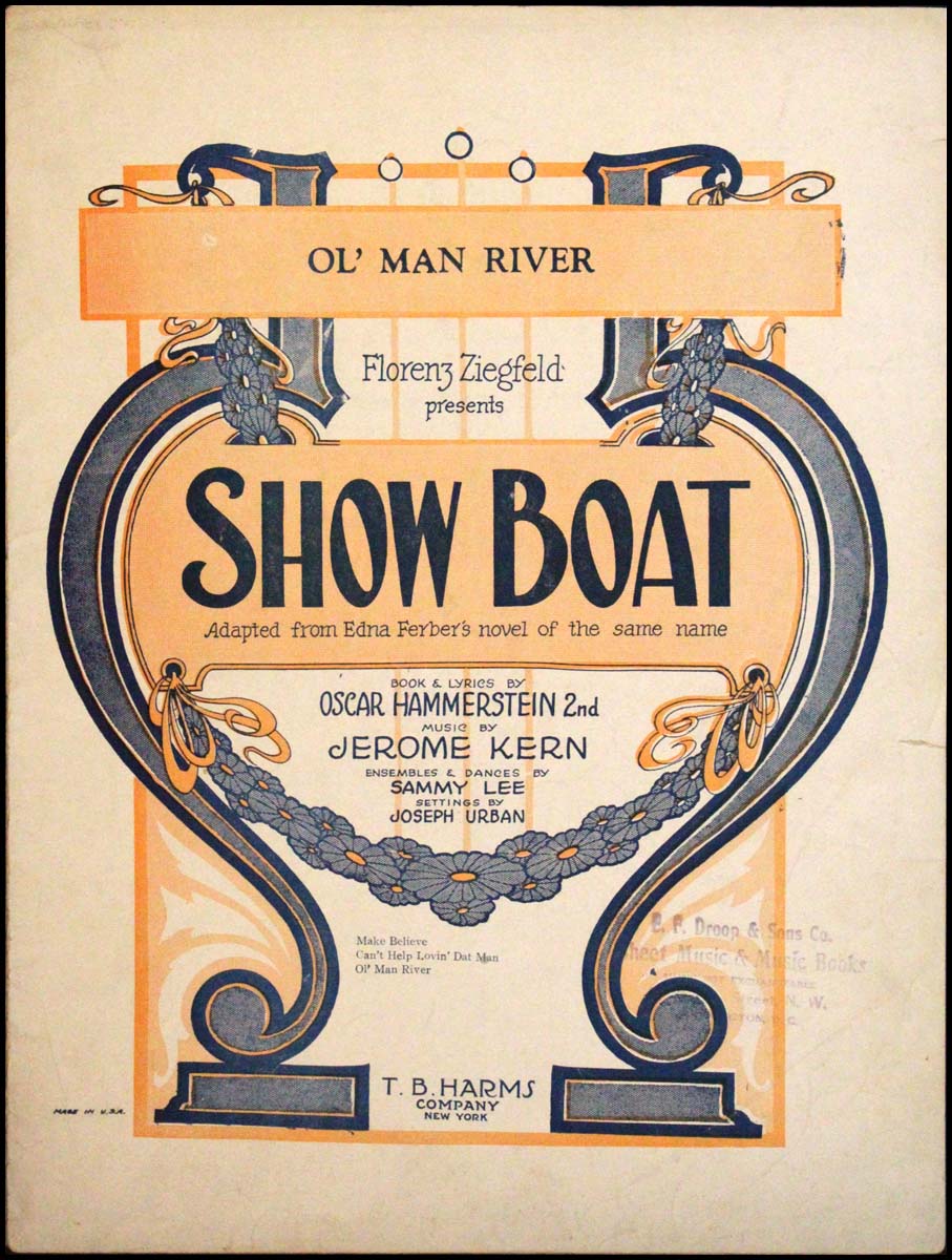 Kern, Jerome. (1885–1945). "Ol' Man River". New York: Harms. 1927. First edition, first issue. Standard format song with lyrics, the rare true first edition with only three songs listed on the cover. Condition is good, slight wear, small right edge tear repaired inside with thin archive tape, light music store stamp lower right. All points as per Fuld p. 412, who locates only 3 copies of the true first edition (LOC, Brown, Fuld).