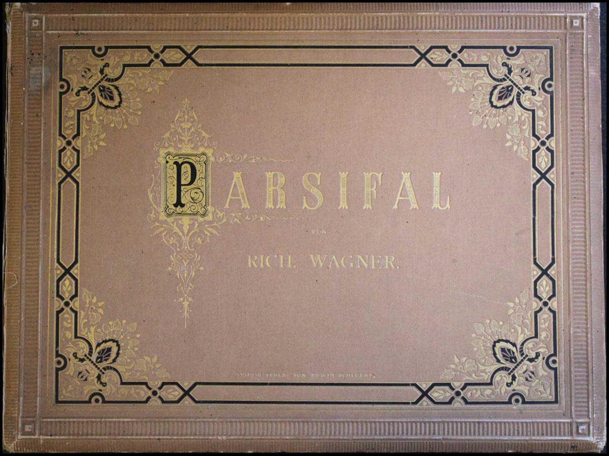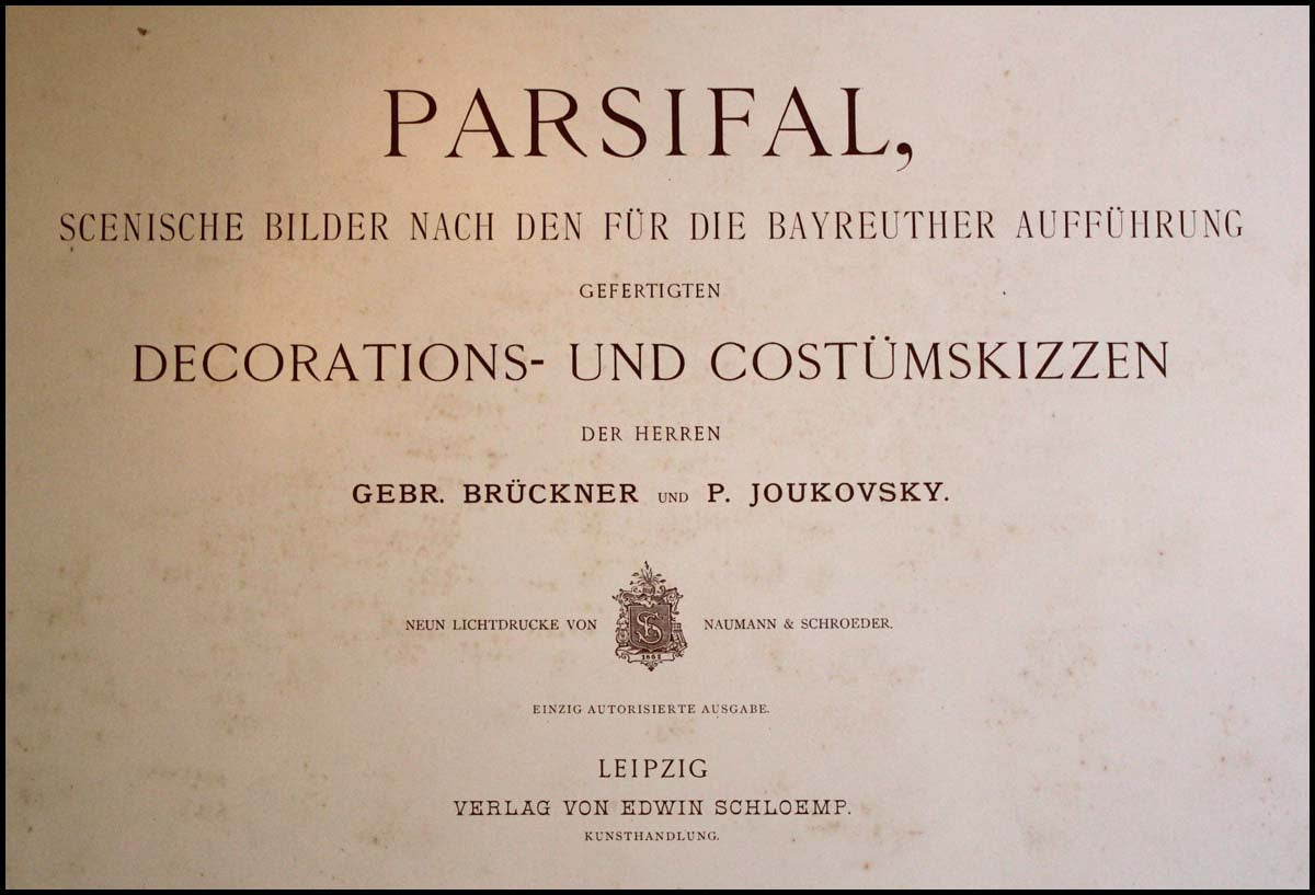 Wagner, Richard. (1813–1883) [G. BRÜKNER et P. JOUKOVSKY]. Parsifal, scenische Bilder nach den für die bayreuther Aufführung defertigten Decorations und Costümskizzen . Leipzig: Verlag von Edwin Schloemp. [1882]. First edition. Large oblong folio, a black and gilt-stamped beige portfolio containing nine mounted plates depicting the original set designs from the first production given in July, 1882. 1 portfolio ([4] p., 9 cards) : 9 mounted heliogravure plates ; portfolio: 30 x 39.5 cm, cards: 28.3 x 37.1 cm, image: 16.2 x 21 cm. Rare. Worldcat records only three copies in the United States.