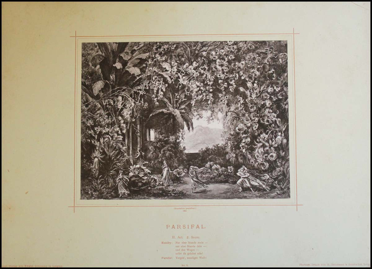 'Only authorized edition,' complete with three preliminary pages in German and nine mounted heliogravure plates with letterpress text on cards after original drawings by Paul von Joukowsky, who designed all of the costumes and 4 of the 5 sets for the first production of Parsifal. The sets were constructed by the brothers Max and Gotthold Brückner. In very good condition apart from some rubbing and wear along the spine of the portfolio boards. Rare.