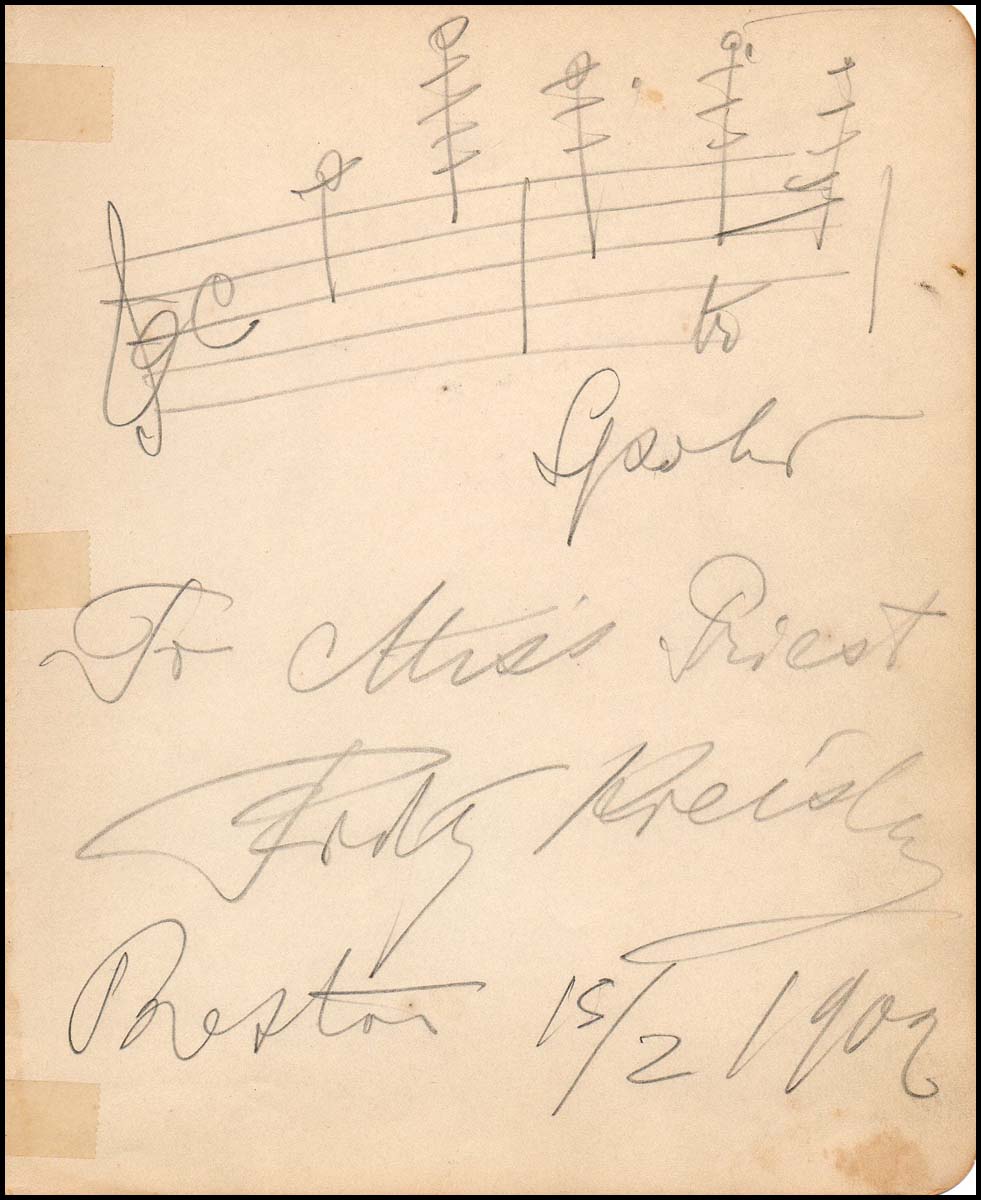 Kreisler, Fritz. (1875–1962) [Spohr, Louis. (1784–1859)]. Spohr "Dramatic Concerto - Autograph Musical Quotation. Unusual AMQS from the beloved American violinist and composer of Austrian birth who was one of the most important musicians of the last century. Boldly accomplished in pencil, Kreisler has written two measures from Spohr's Concerto in A minor (the "Dramatic"), inscribed, signed and dated Boston, 15/2, 1902. 6.5 x 8 inches. Tape remnants along the left edge, one slightly touching the start of the inscription and otherwise fine.