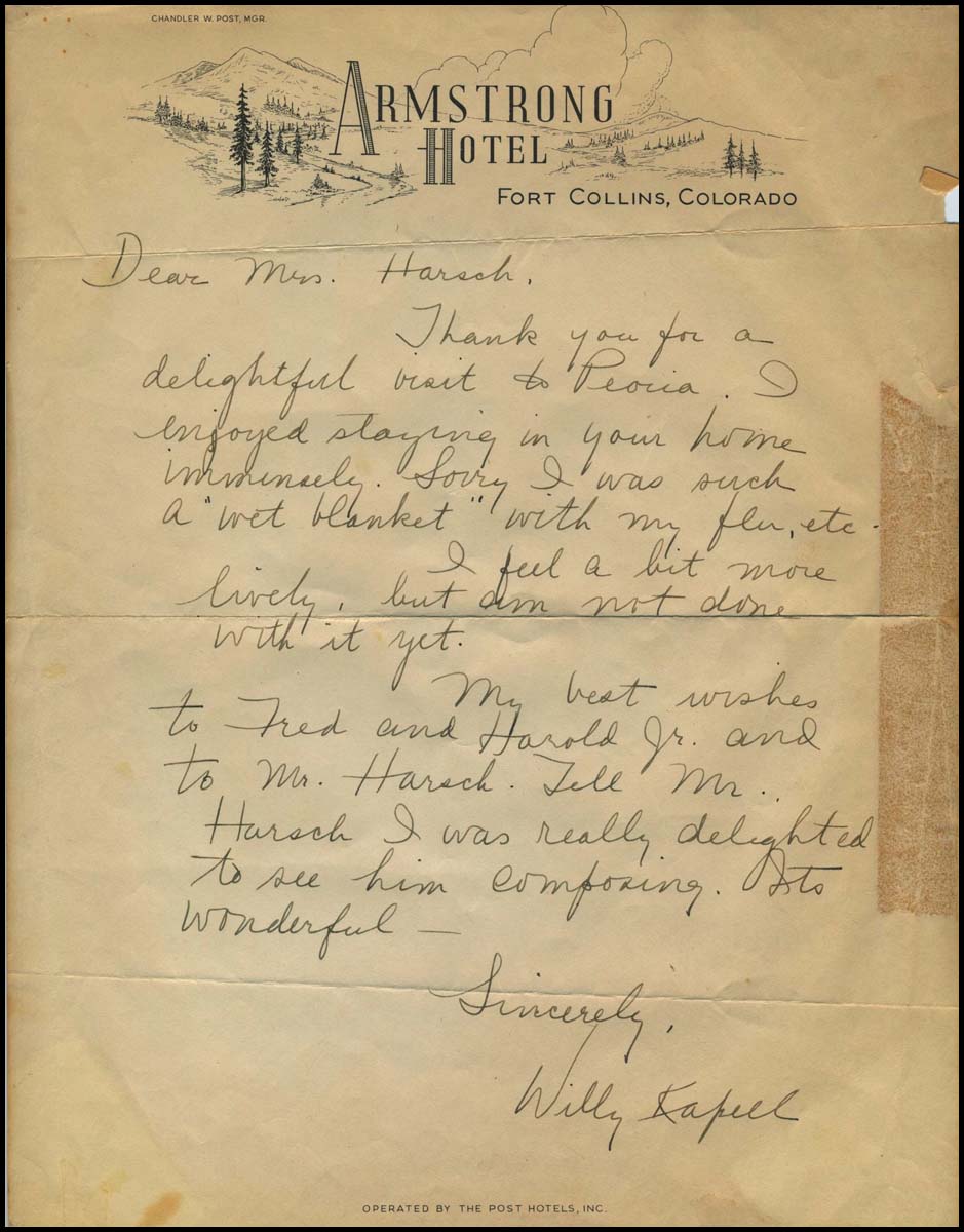 1 page, letterhead of the Armstrong Hotel in Fort Collins, CO. n.d. In full: "Thank you for a delightful visit to Peoria. I enjoyed staying in your home immensely. Sorry I was such a 'wet blanket' with my flue, etc. I feel a bit more lively, but am not done with it yet. My best wishes to Fred and Harold Jr. and to Mr. Harsch. Tell Mr. Harsch I was really delighted to see him composing. It's wonderful - Sincerely, Willy Kapell." Mailing creases, chipped edge, some splitting along the right side repaired with tape on the verso and with staining/show-through in that area.
