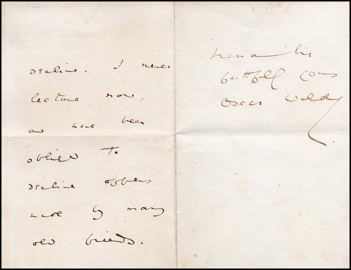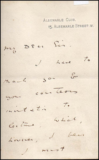 [Literature & Visual Arts] Wilde, Oscar. (1854–1900). Autograph Letter. Autograph letter from the Irish writer and leader of the Aesthetic Movement, and author of such works as The Picture of Dorian Gray, The Importance of Being Earnest, and The Happy Prince. ALS, 3 pages, 9.6 x 14 cm, no date. Letter to "My Dear Sir" on letterhead of the Albemarle Club. In full, "I have to thank you for your courteous invitation to lecture, which, however, I fear I must decline. I never lecture now, and have been obliged to decline offers made by many old friends...Oscar Wilde. " In fine condition, with intersecting folds and a few spots of light soiling.