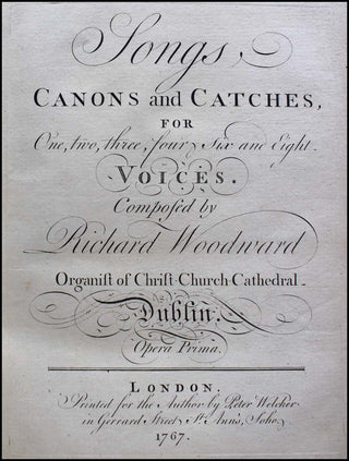 [English-Irish Music] Woodward, Richard. (1743 - 1777). Songs, Canons and Catches, for One, two, three, four, six and Eight Voices. London: Printed for the Author by Peter Welcker. 1767. First edition. Folio. Approximately 14 x 9.5 inches. [vi], 85, [1, blank] pages. All pages engraved. Bound to style in modern full dark brown calf, covers ruled in gilt with gilt floral cornerpieces, spine tooled in gilt in compartments, brown morocco gilt lettering label, five raised bands, new marbled endleaves. Text lightly toned and thumbsoiled. Fine.