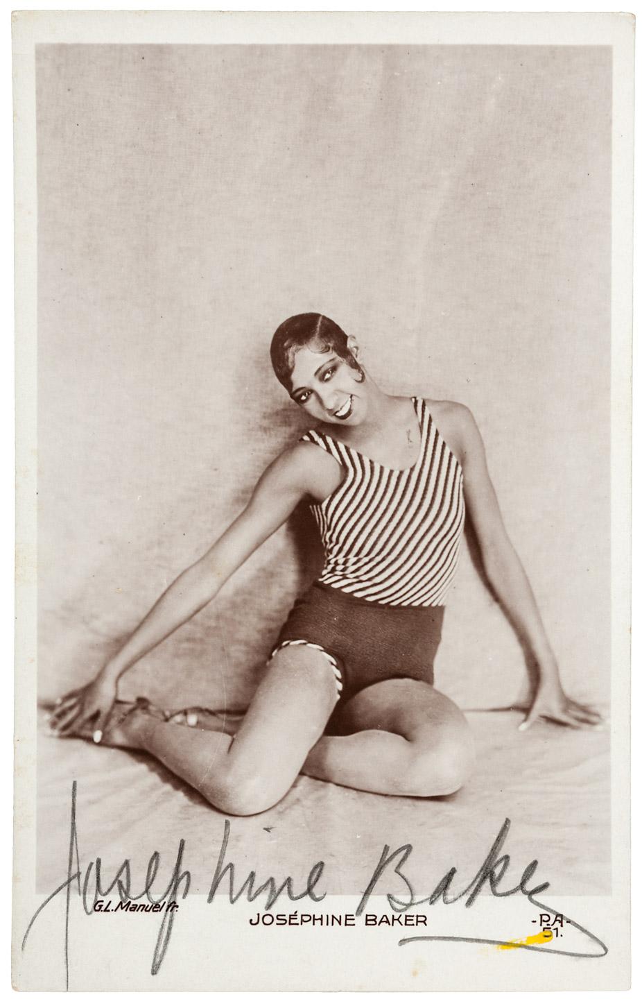 Baker, Josephine. (1906–1975). Signed Photograph . Signed G.L Manuel of Paris vintage sepia postcard photograph of the legendary entertainer shown in a sexy costume, boldly signed "Josephine Baker" in pencil. 10 x 15 cm. In fine condition.