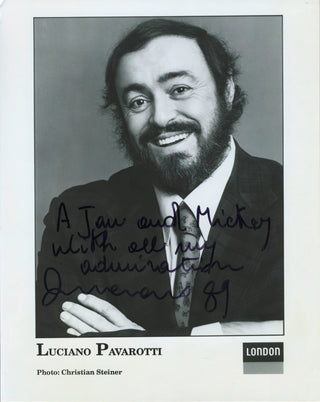 Pavarotti, Luciano. (1935-2007) [Rooney, Mickey. (1920-2014)]. Signed Photograph to Mickey Rooney. London Records promotional photograph by Christian Steiner of the great tenor, signed and inscribed "A Jan and Mickey with all my admiration / Luciano 89." 8 x 10 inches. In fine condition.